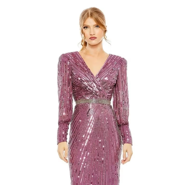 ชุดราตรีทรงเอไลน์สำหรับผู้หญิงชุดเดรสออกงานแบบทางการแขนยาวประดับด้วยเลื่อมประดับด้วยลูกปัดปักเลื่อมสุดหรู