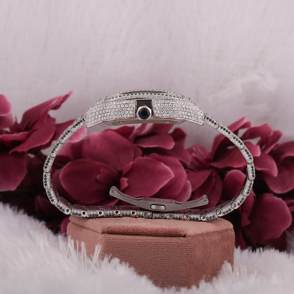 นาฬิกากลไกอัตโนมัติสไตล์ฮิปฮอปหรูหราสีดำและสีขาวเพชรที่ออกแบบมาอย่างสง่างามหน้าปัดเลขโรมันสีแดง