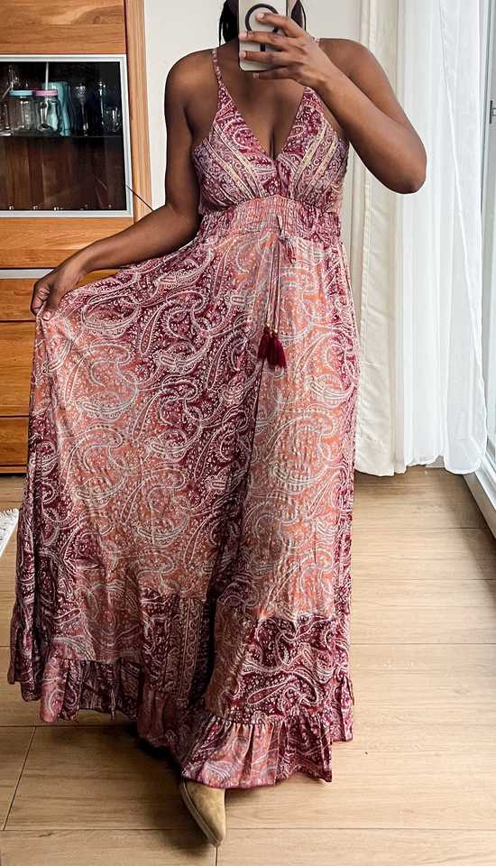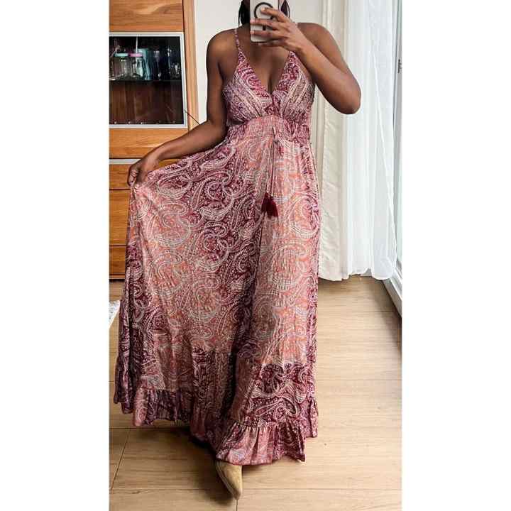 ชุดราตรีผ้าฝ้ายออร์แกนิกยาวกรอมพื้นสไตล์โบฮีเมียนสุดหรู แต่งลูกไม้สีน้ำเงินลายดอกไม้สไตล์วินเทจ พร้อมกระดุมตกแต่ง แขนกุด