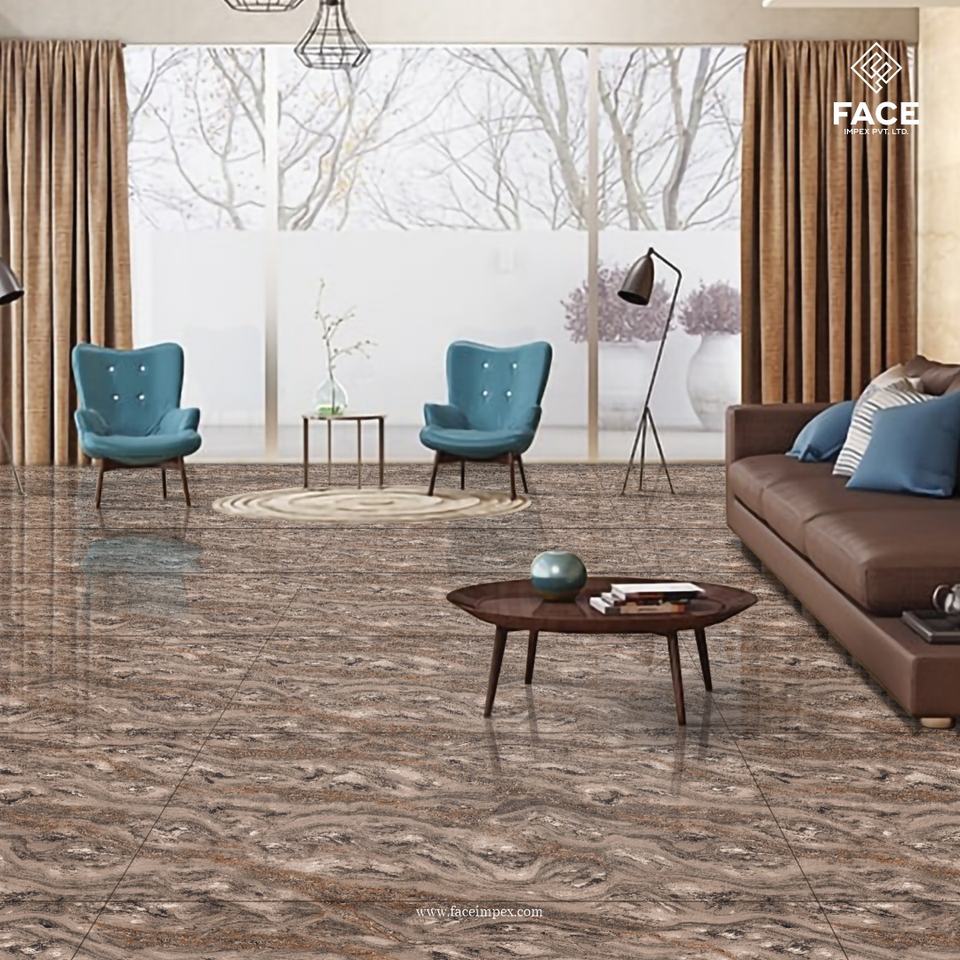 แผ่นกระเบื้องหรูหราขนาด 600x1200 มม. ออกแบบมาเพื่อความสง่างามที่โดดเด่นในที่พักอาศัย ลุคมทันสมัย ผิวสัมผัสสวยงาม เหมาะสำหรับห้องโถง