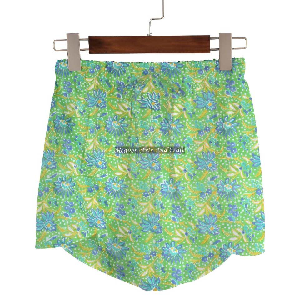 ผ้าฝ้ายพิมพ์ลายบล็อกด้วยมือสุดหรู กางเกงขาสั้นเอวยางยืดผูกเชือก เหมาะสำหรับใส่ลำลองช่วงฤดูร้อน ไปเที่ยวชายหาด สำหรับผู้หญิง
