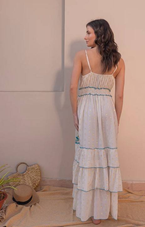 ชุดเดรสยาวปักเลื่อมสีทองลายดอกไม้สีฟ้าสำหรับผู้หญิงชุดเดรสยาวสไตล์โบฮีเมียนเก๋ไก๋สำหรับฤดูร้อน