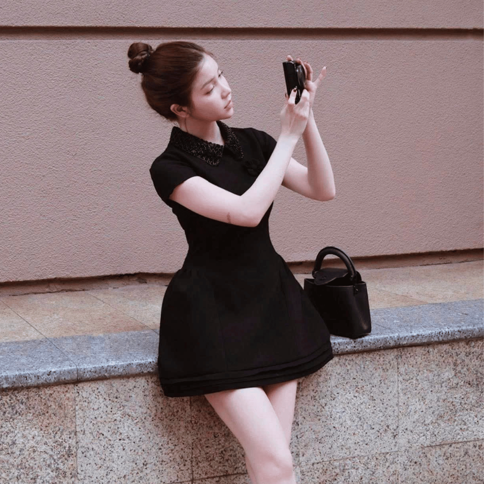 ชุดเดรสผู้หญิงสั่งตัดสุดหรู ทรงเอไลน์สั้น แขนสั้น ทรงเข้ารูป ผ้าทอธรรมชาติ สีดำล้วน สไตล์ลำลอง ซับในผ้าไหมเวียดนาม สั่งตัดได้