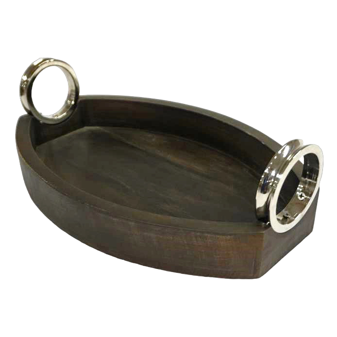 ถาดเสิร์ฟไม้วอลนัทสีเข้มสุดหรูพร้อมที่จับโลหะทรงรีสำหรับโชว์อาหารขนมขบเคี้ยว