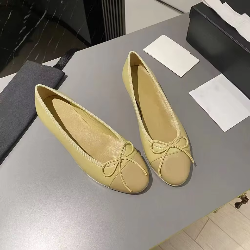 รองเท้าบัลเล่ต์ผู้หญิงแบรนด์หรู ดีไซน์เนอร์ หนังแท้ ประดับโบว์ หัวกลม สีเข้าชุด รองเท้าแบบสวม