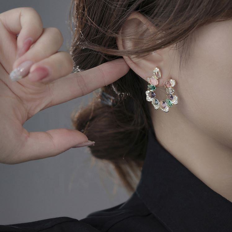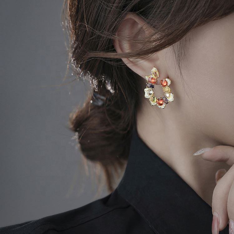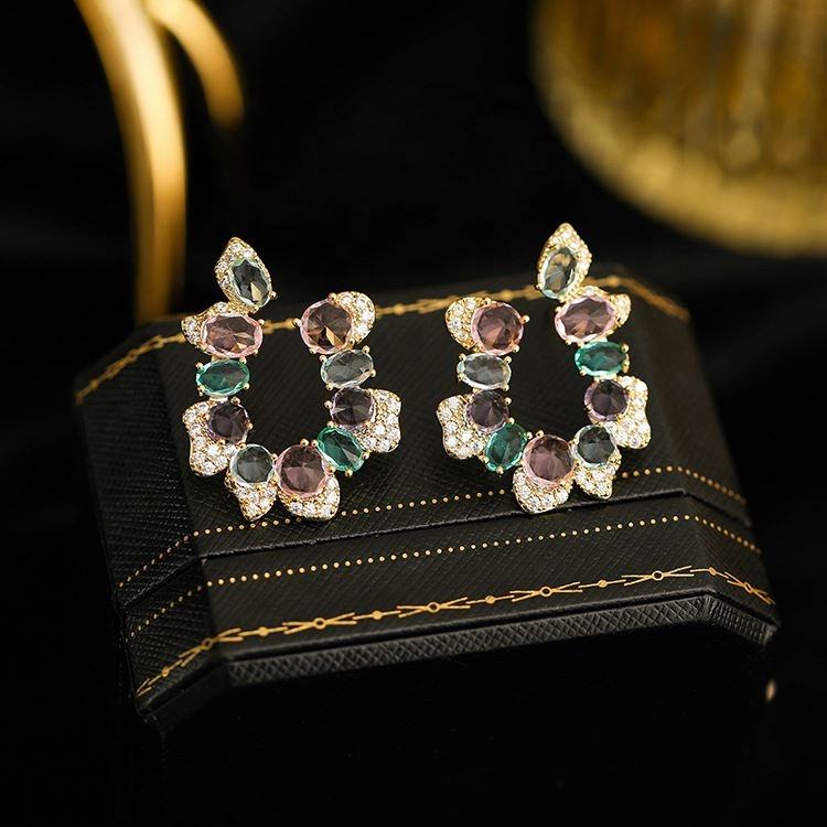 ต่างหูทรงตัวยู สไตล์นางฟ้าสุดหรู สำหรับฤดูใบไม้ผลิและฤดูร้อน ชุบทองแดงเคลือบทอง ประดับด้วยพลอยสีและเพชรซิร์คอนทรงเรขาคณิต