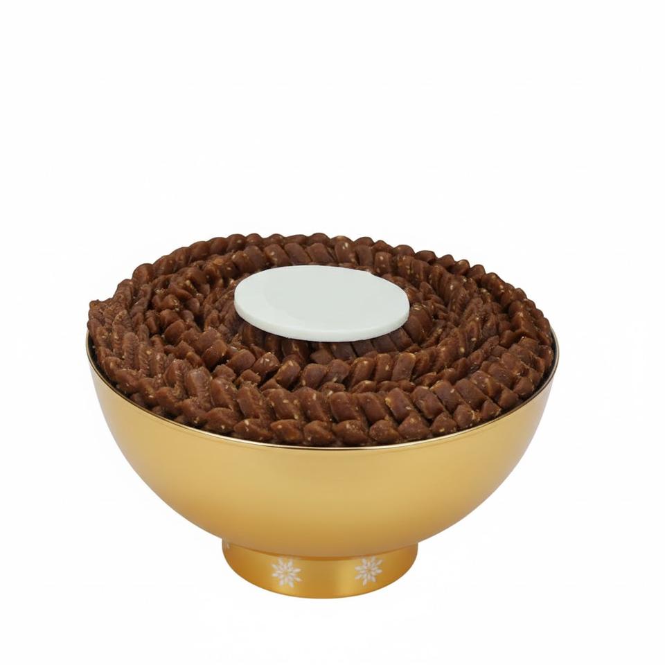 ชามเสิร์ฟช็อกโกแลตโลหะสีทองสุดหรู พร้อมลายดอกไม้สีเงิน เหมาะสำหรับจัดแสดงขนมหวานในงานอีเว้นท์และงานเฉลิมฉลองต่างๆ