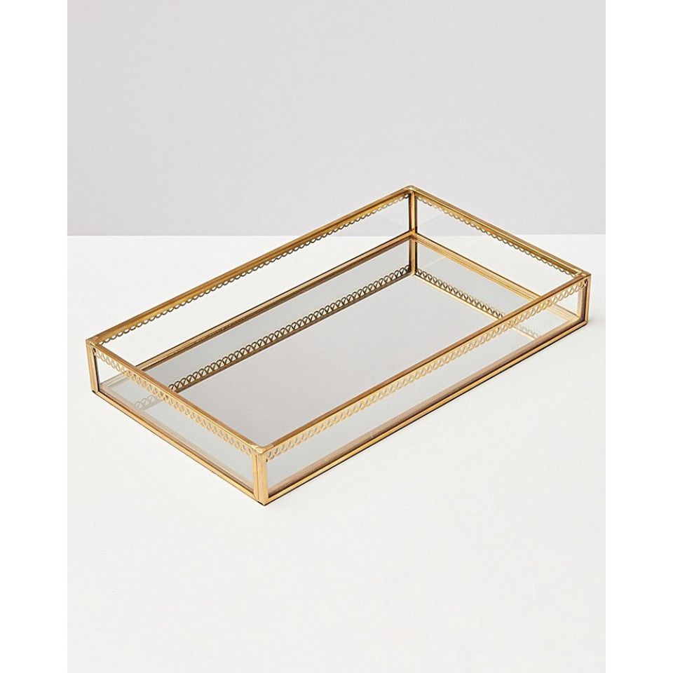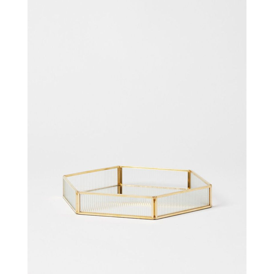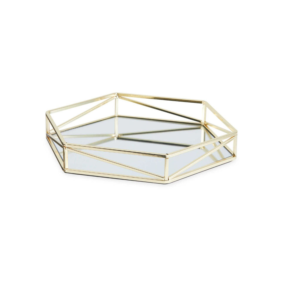 ถาดกระจกทรงหกเหลี่ยมหรูหราพร้อมขอบโลหะสีทองสำหรับจัดแสดงน้ำหอมและเครื่องประดับ ราคาโรงงาน