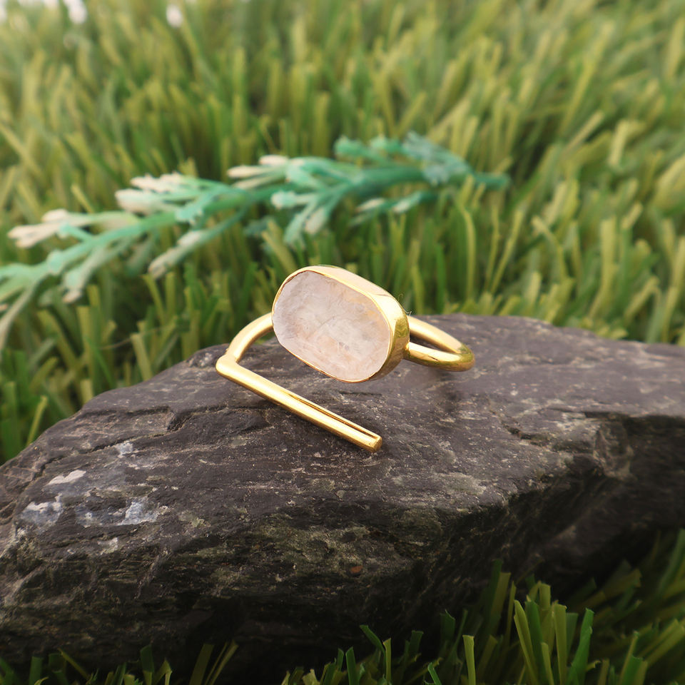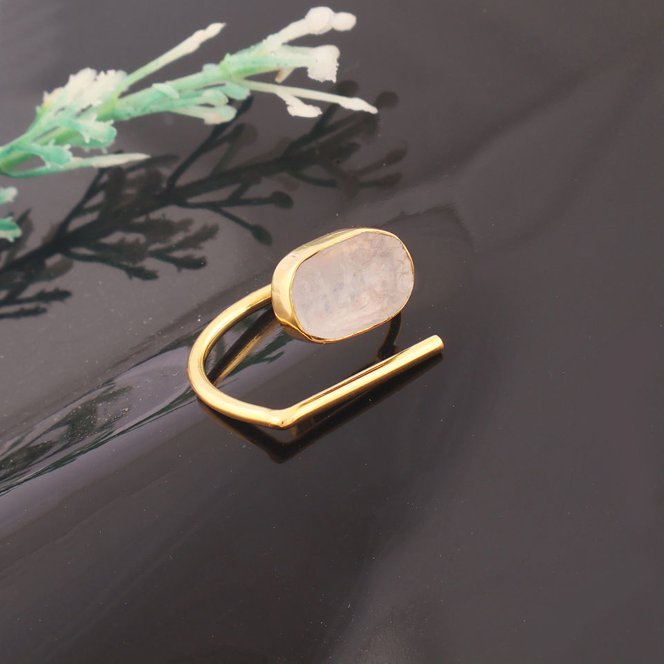 เครื่องประดับที่หรูหราของแท้ดูดิบสีฟ้าฉูดฉาดหินมูนสโตนปรับได้แหวนทองเหลืองชุบทองการตั้งค่าวงแหวนทรงสี่เหลี่ยม