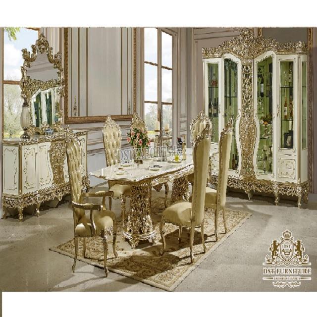 ชุดเฟอร์นิเจอร์ห้องรับประทานอาหารสไตล์กษัตริย์หรูหราหรูหราโต๊ะรับประทานอาหารไม้สักแกะสลักโต๊ะรับประทานอาหารทำจากไม้แกะสลักด้วยมือ