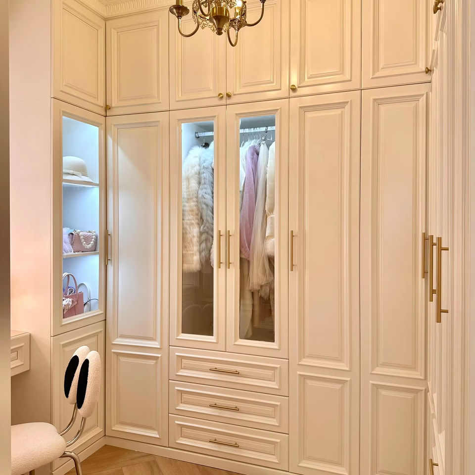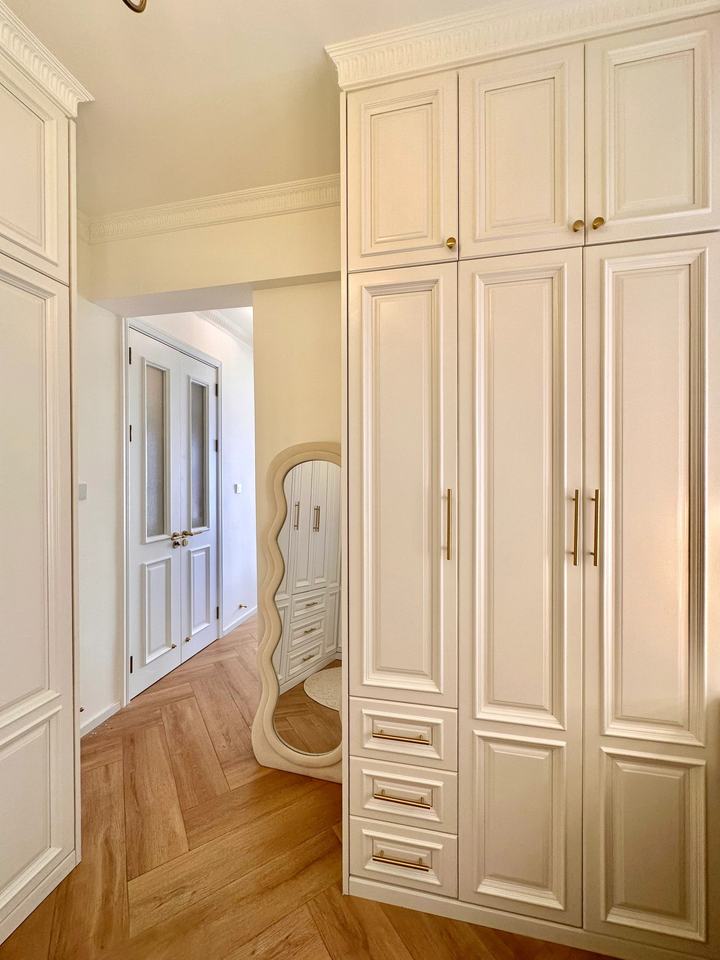 ตู้เสื้อผ้าพื้นที่ขนาดใหญ่ที่หรูหราพร้อมรูปลักษณ์ที่สวยงามช่วยเพิ่มความหรูหราให้กับห้องพัก