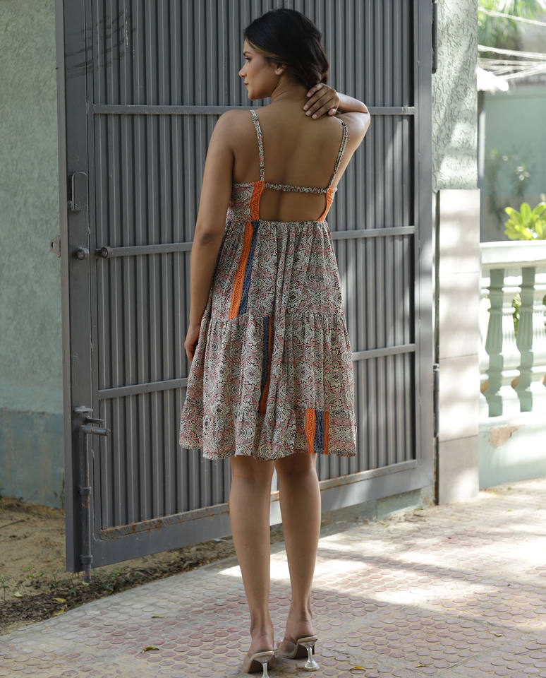 เดรสสั้นพิมพ์ลายสปาเก็ตตี้สำหรับผู้หญิงกระโปรงคอวีเปิดหลังมีกระเป๋าสำหรับฤดูร้อนฤดูใบไม้ร่วง