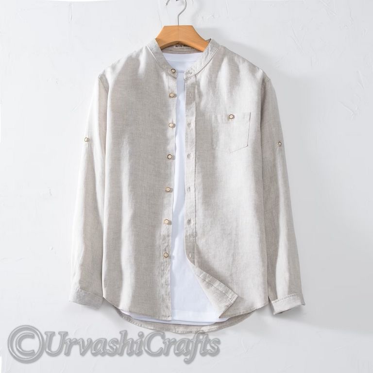เสื้อเชิ้ตผ้าฝ้ายลินินลำลองผู้ชายสุดหรู ทรงหลวม แขนยาว คอตั้ง สีพื้น สำหรับส่งออกในราคาขายส่ง