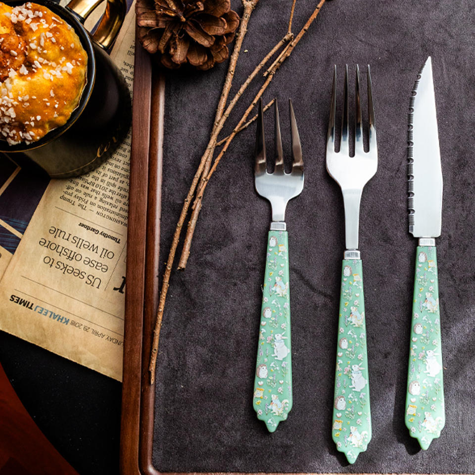 ชุดช้อนส้อมมีดงานฝีมือเชอรีสุดหรู ทันสมัย เป็นมิตรกับสิ่งแวดล้อม ทำจากสแตนเลสสีเงิน ด้ามเซรามิก ขัดเงา