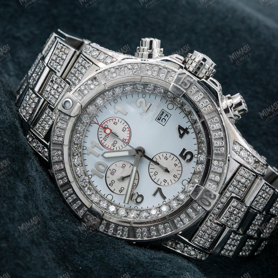 นาฬิกาเพชรโมอิสหรูหราพร้อมหน้าปัดสีขาวประกายฟังก์ชันโครโนกราฟและขอบเพชรและสายรัด
