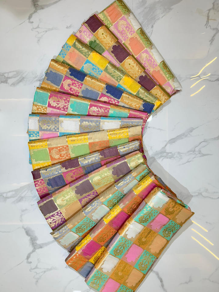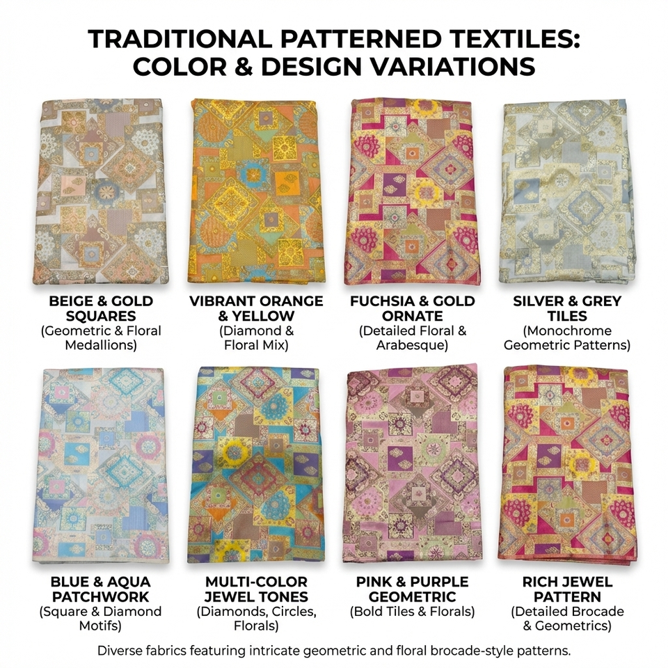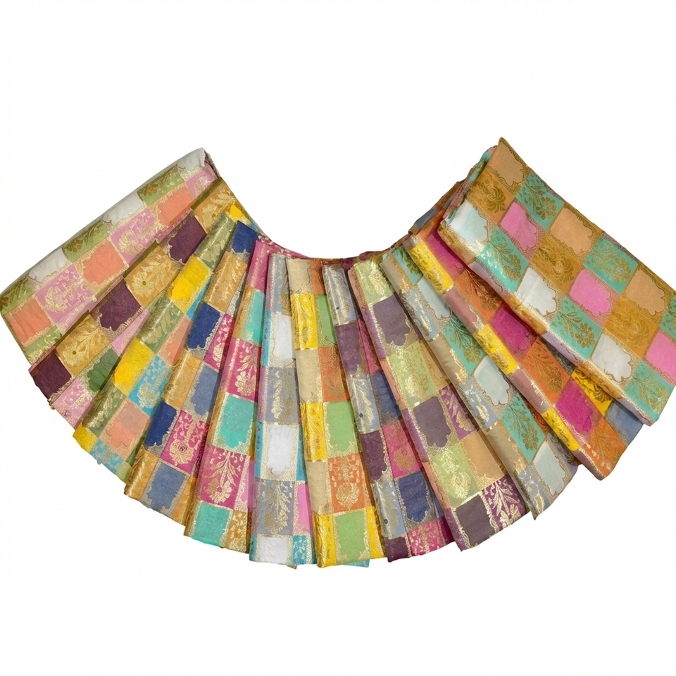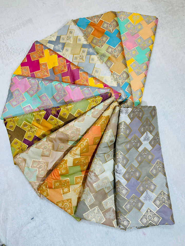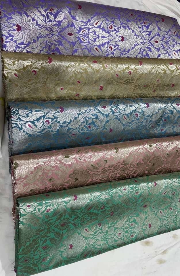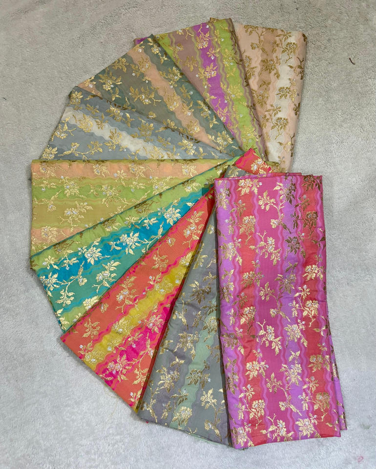 ผ้าไหมบรอกเคดหรูหรา ประดับด้วยลายทองคำแบบซารี ทออย่างประณีต เหมาะสำหรับชุดเจ้าสาวและงานตกแต่งภายในแบบราชวงศ์