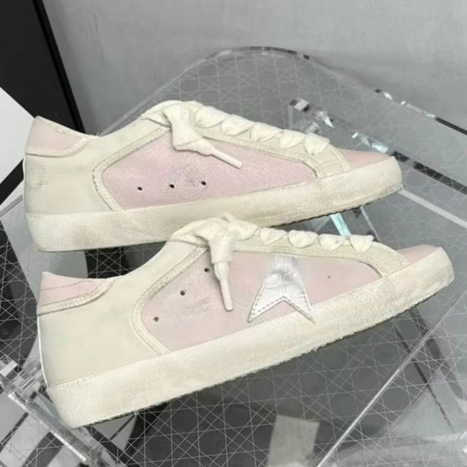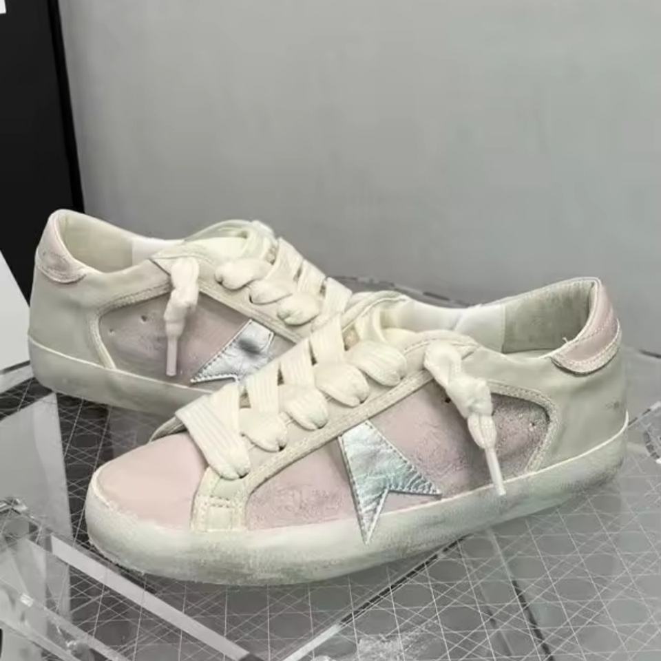รองเท้าหนังสีชมพูสไตล์วินเทจสำหรับผู้หญิง คุณภาพหรูหรา ประดับดาวสีเงิน พร้อมเชือกผูก พื้นรองรับแรงกระแทก ลายพราง เพิ่มความสูง แบบสปอร์ต แฟลต แคชชวล