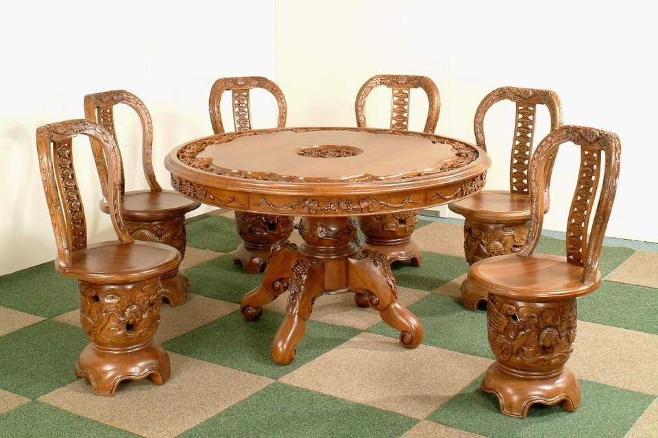 โต๊ะอาหารไม้สักทรงกลมแกะสลักสไตล์โรแมนติกสุดหรูพร้อมการแกะสลักรูปองุ่นชุดโต๊ะอาหารสำหรับร้านอาหารและห้องรับประทานอาหาร