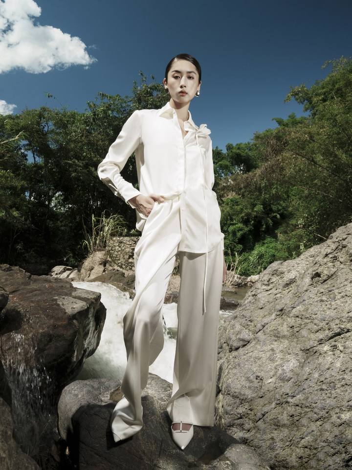 กางเกงลำลองสตรีสไตล์หรูหรากางเกงขากว้างสีขาว89% triacetate 11% ผ้าโพลีเอสเตอร์สีขาวแบบเวียดนาม