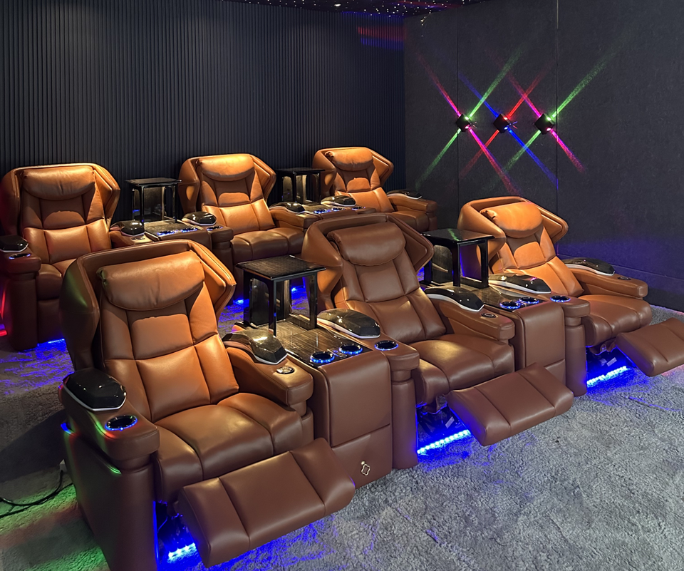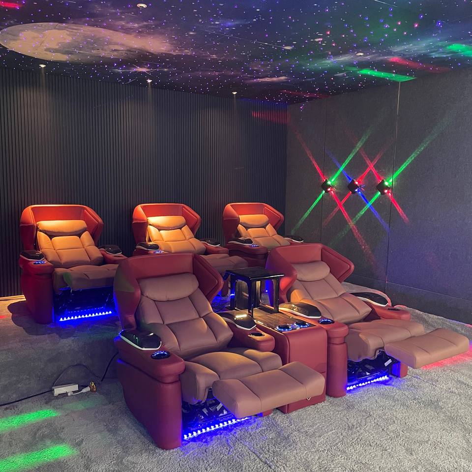 ชุดโซฟาปรับนอนได้สำหรับโรงละครหรูหราเฟอร์นิเจอร์โรงภาพยนตร์เก้าอี้พักผ่อนโซฟาห้องสื่อที่นั่งในภาพยนตร์