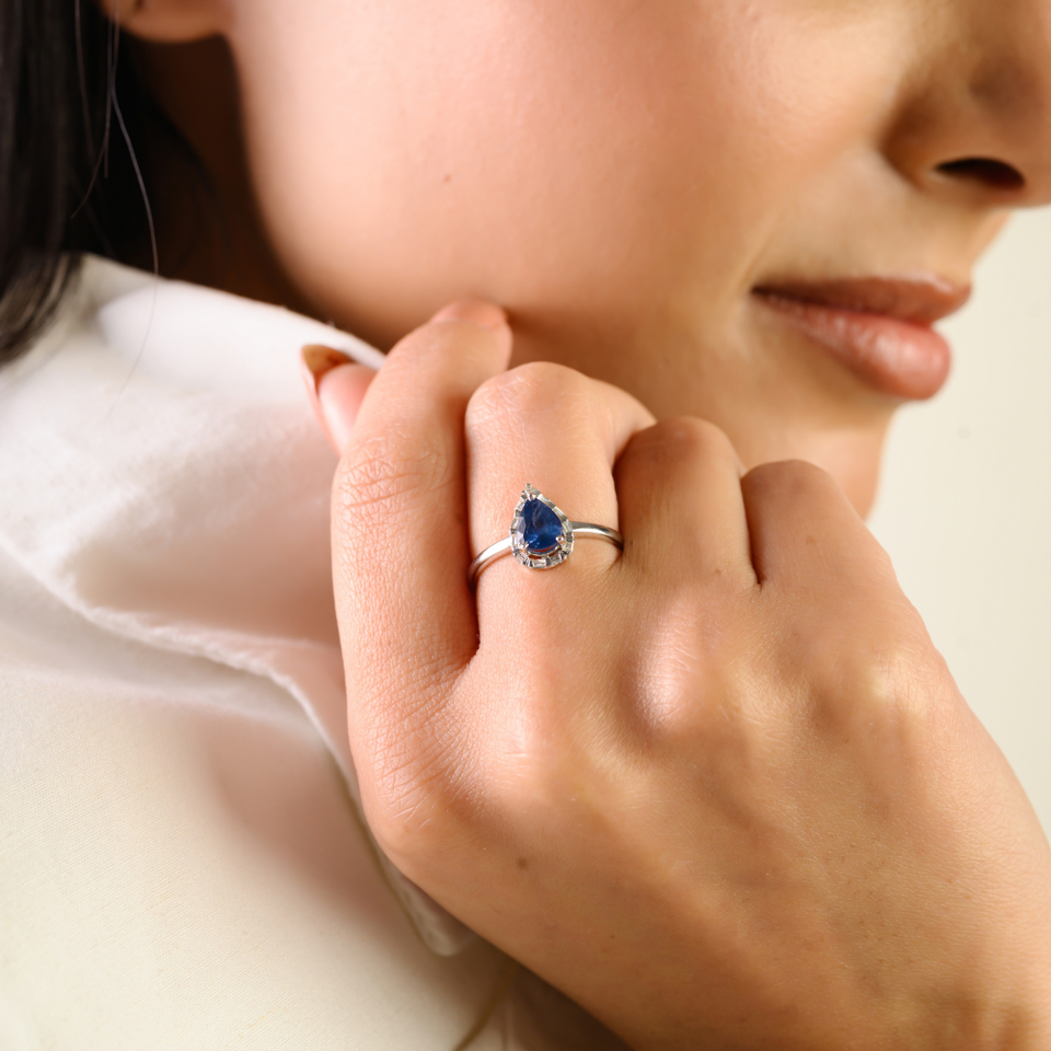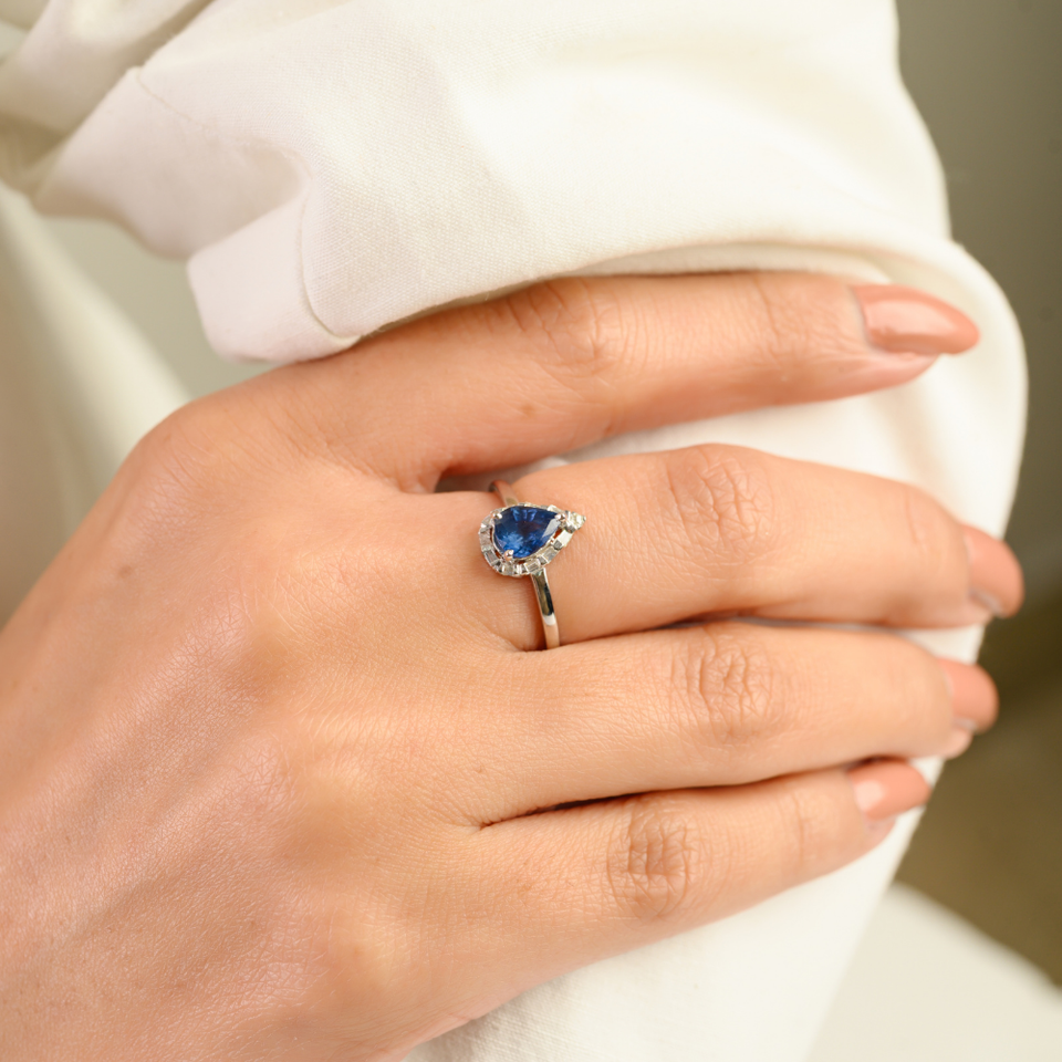 แหวนหมั้นทองคำขาว 14K คุณภาพสูงสุด ประดับด้วยไพลินสีน้ำเงินทรงลูกแพร์และเพชรแบบวงแหวน ดีไซน์หรูหรา จำหน่ายเป็นชุด
