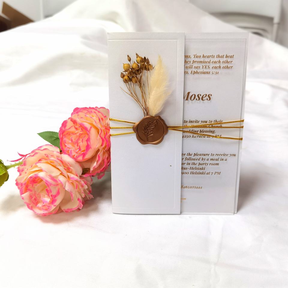 รวม:การ์ดอะคริลิคหนา1-2มม. + ซอง + ซีลขี้ผึ้ง + ดอกไม้แห้ง