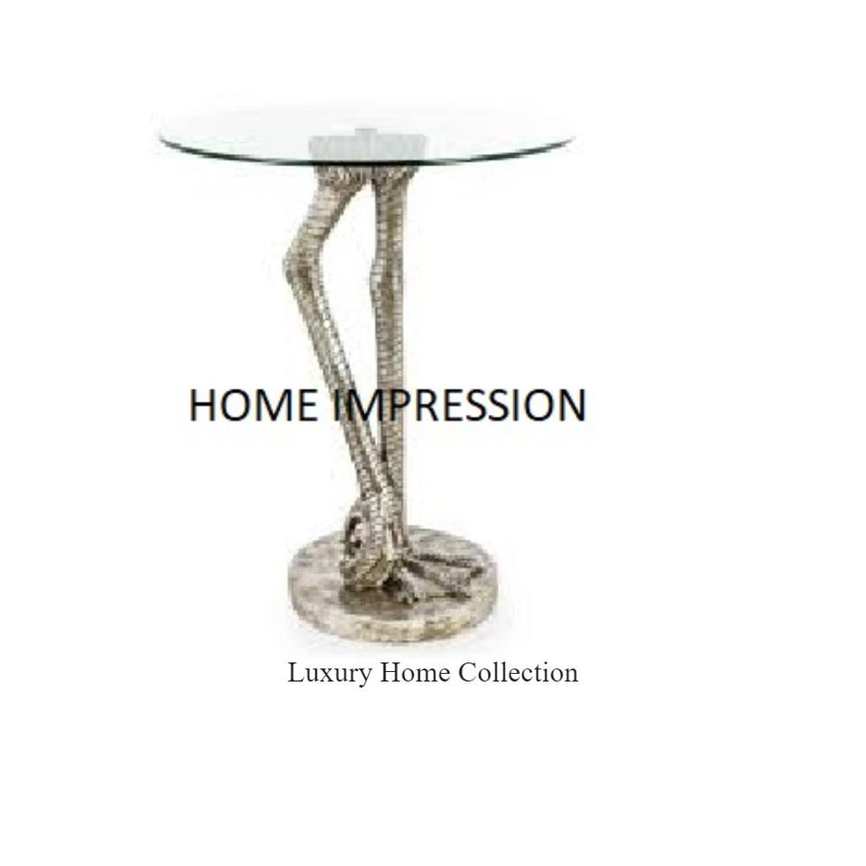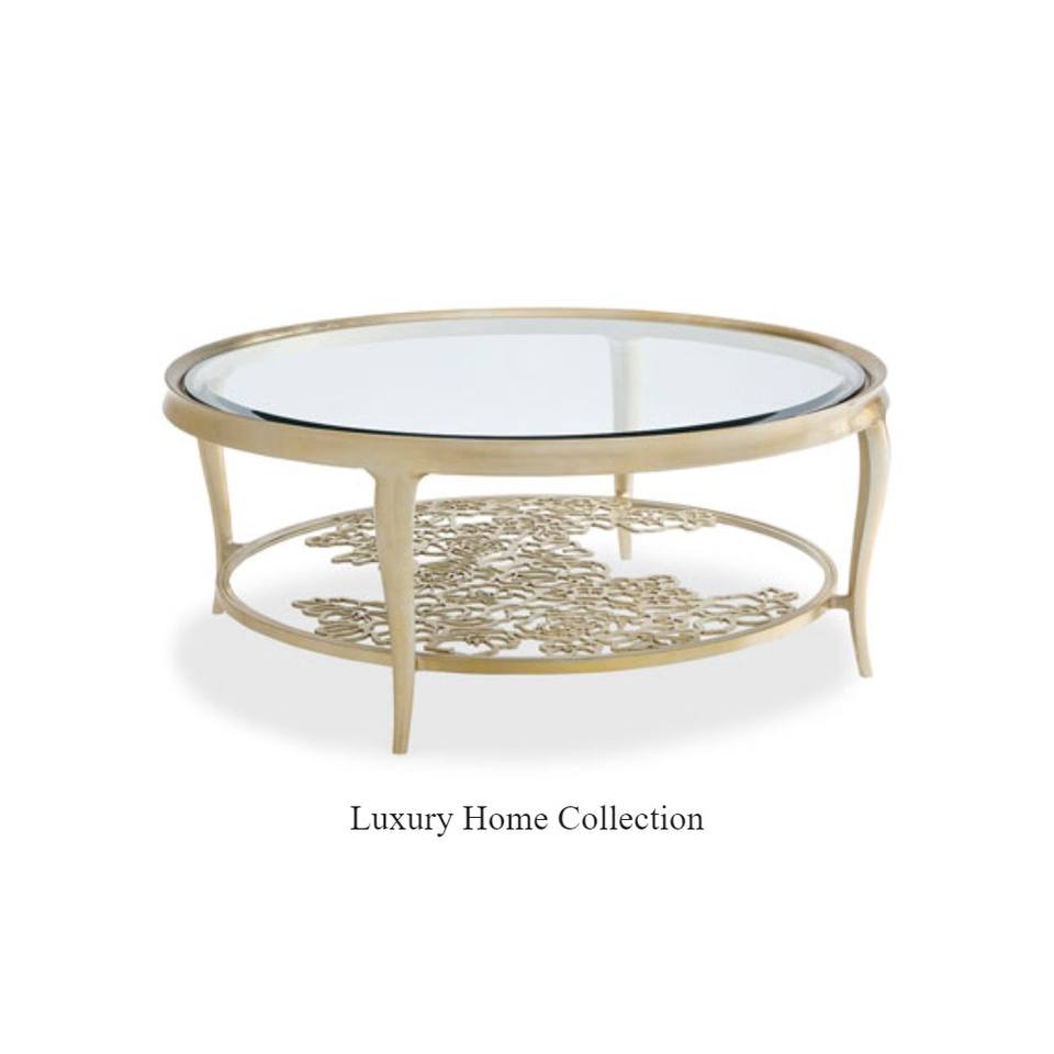 โต๊ะกลางและโต๊ะข้างทรงกลมดีไซน์เป็นเอกลักษณ์หรูหราพร้อมกระจกด้านบนและกรอบโลหะเกรดสูงสีทองเงา