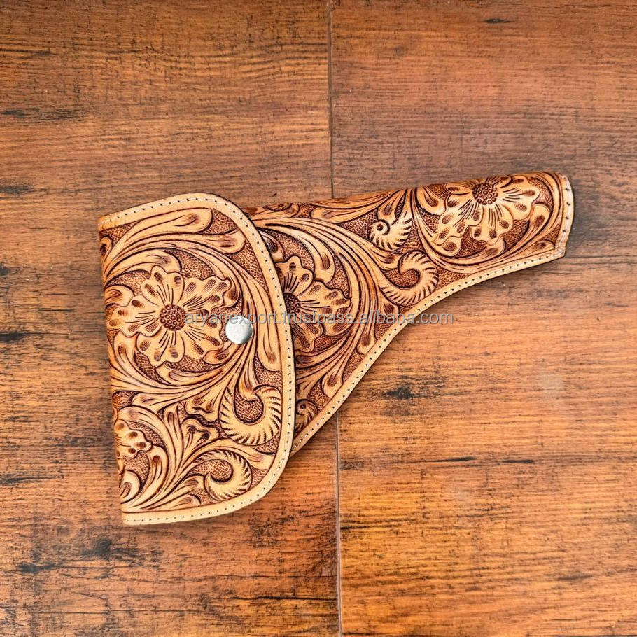 ซองปืนล่าสัตว์หนังวัวคาวบอยแกะสลักจริงทำจากหนังวัวแท้แบบมีห่วงที่ทำด้วยมือสไตล์ตะวันตกสุดหรู
