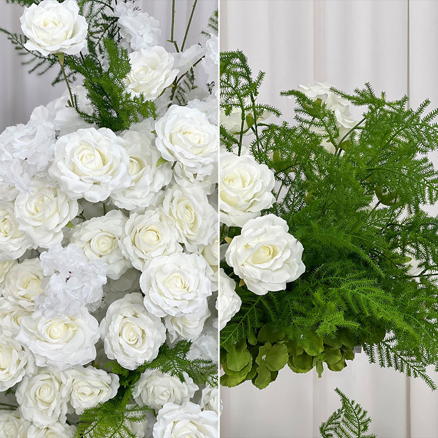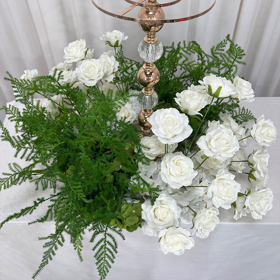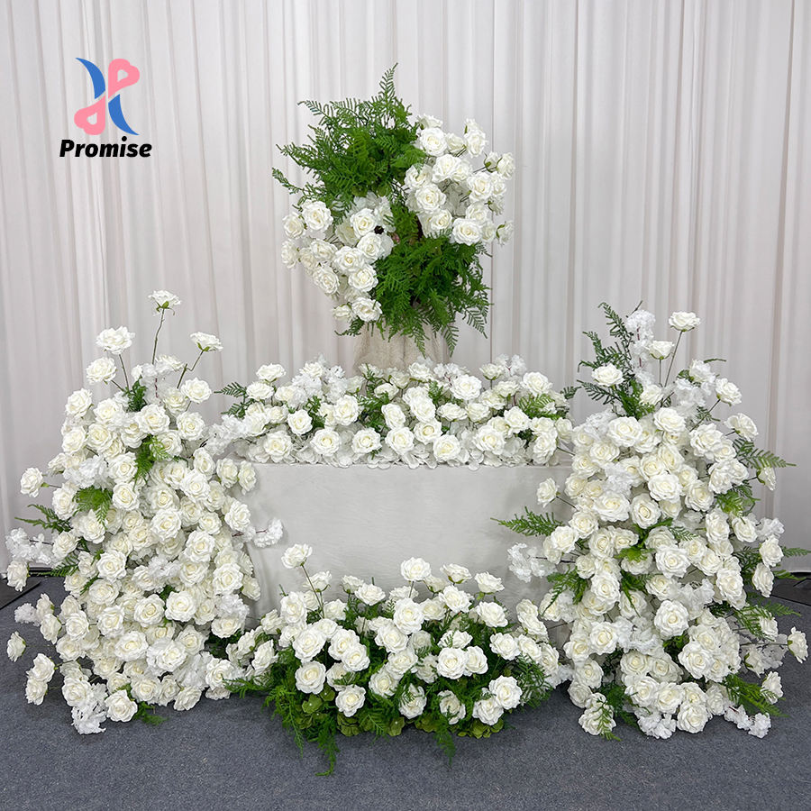 ซุ้มดอกไม้ประดิษฐ์กุหลาบและดอกโบตั๋นสีขาวหรูหราจากผ้าไหม สำหรับตกแต่งโต๊ะกลางงานแต่งงานและฉากหลัง