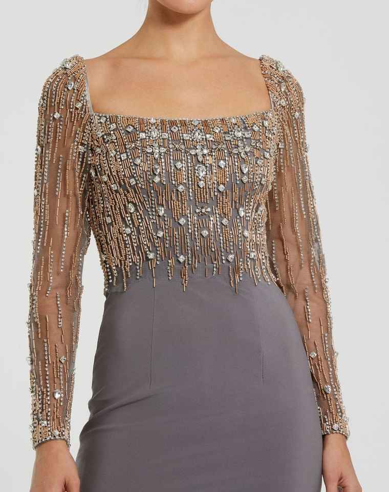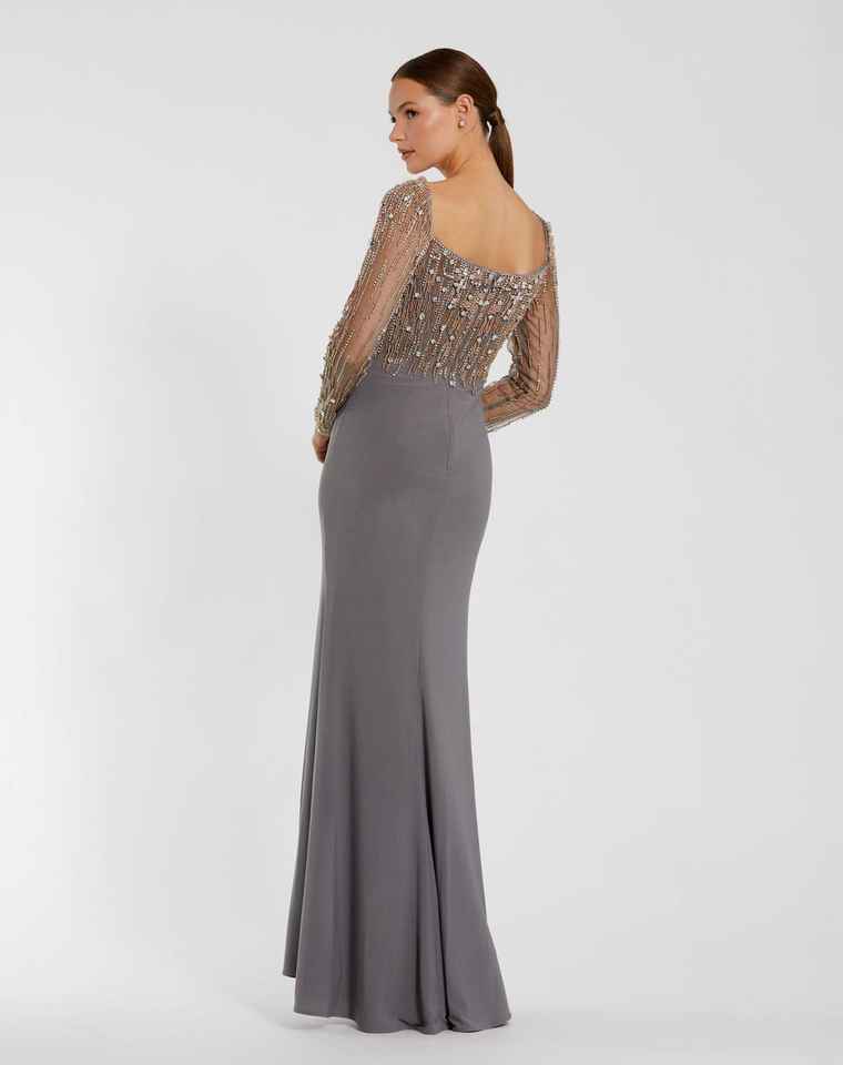 ชุดเดรสออกงานกลางคืนประดับด้วยลูกปัดของผู้หญิงชุดเดรสหรูหราแขนยาวเรียบเงาเรียบหรูสำหรับงานพรอมและปาร์ตี้
