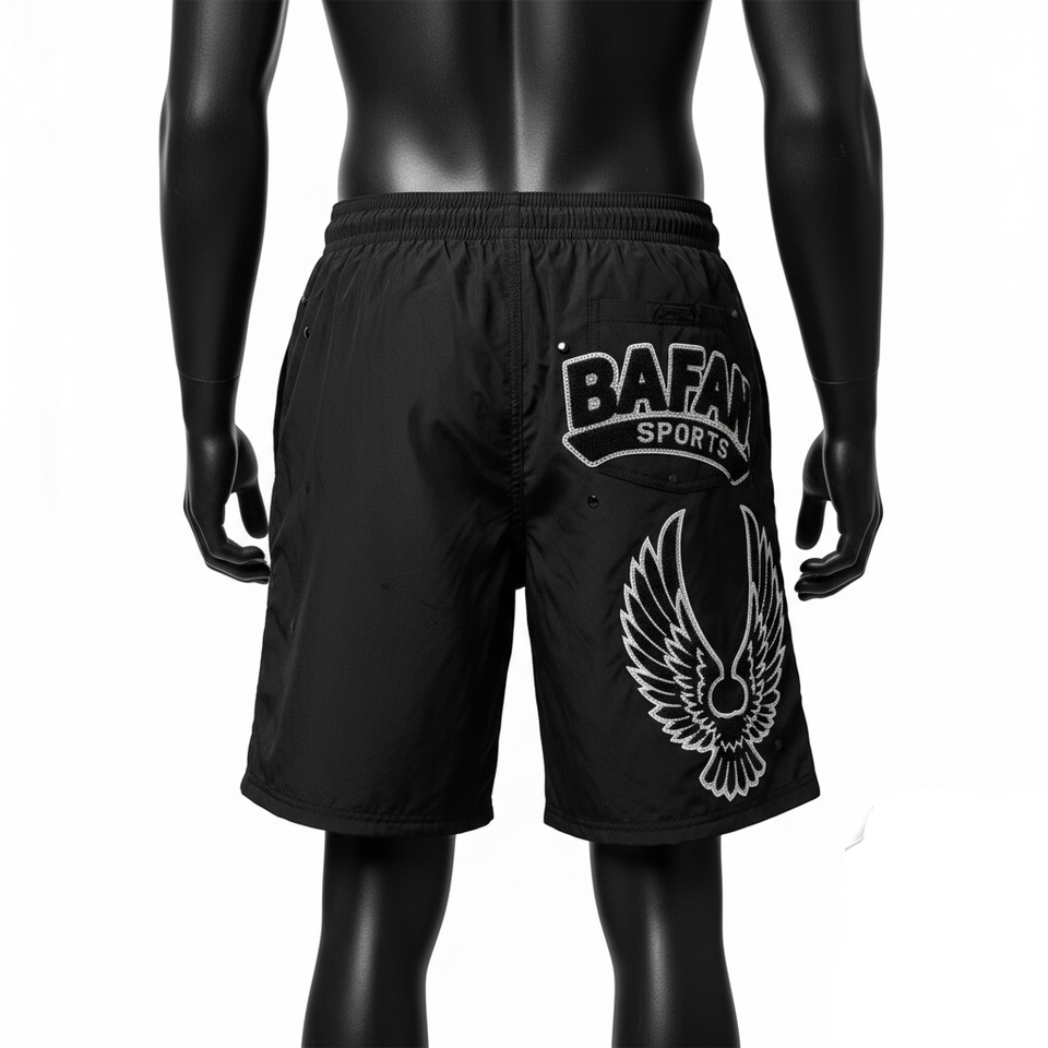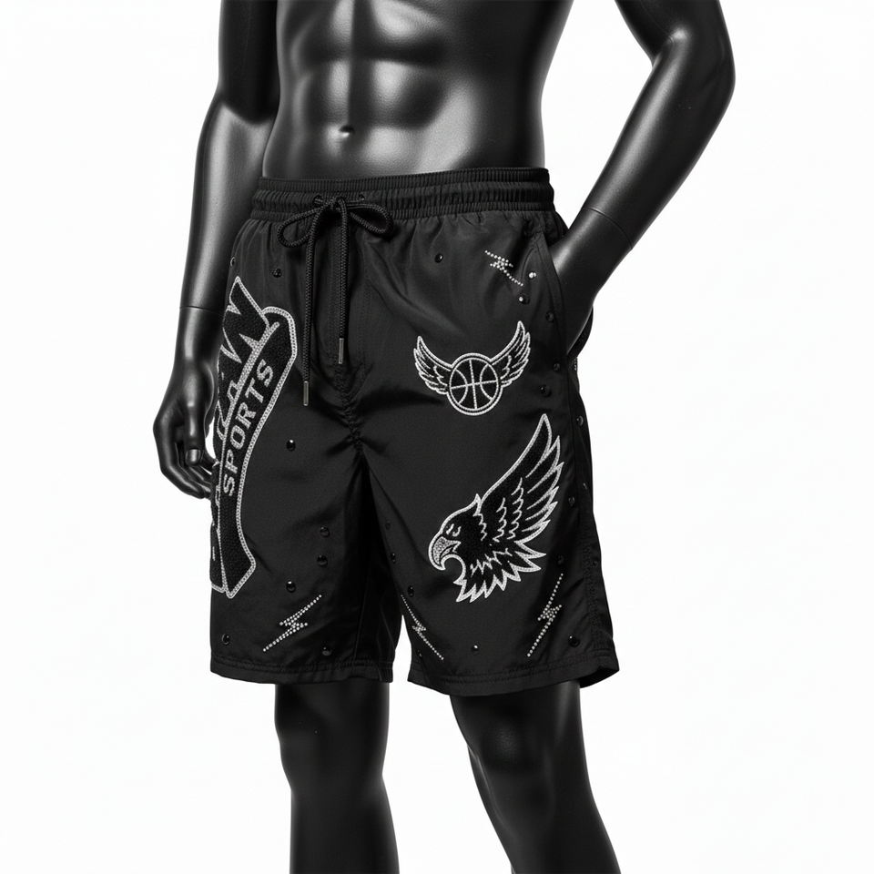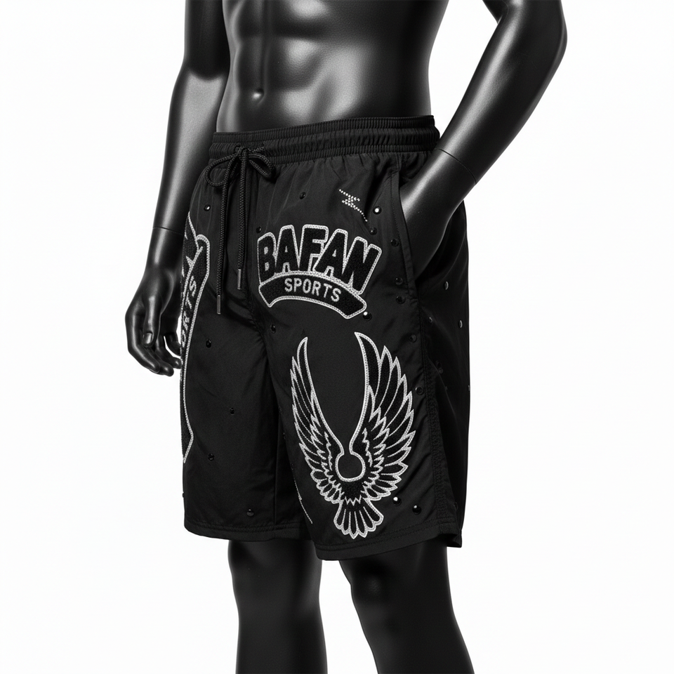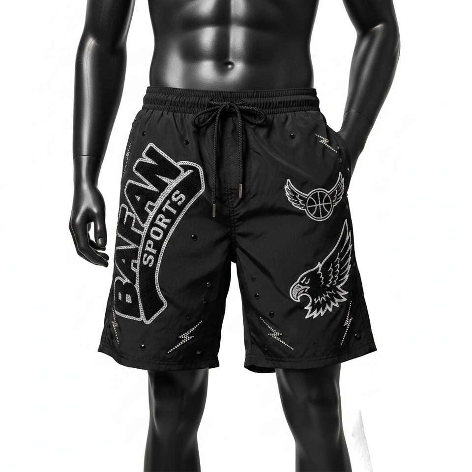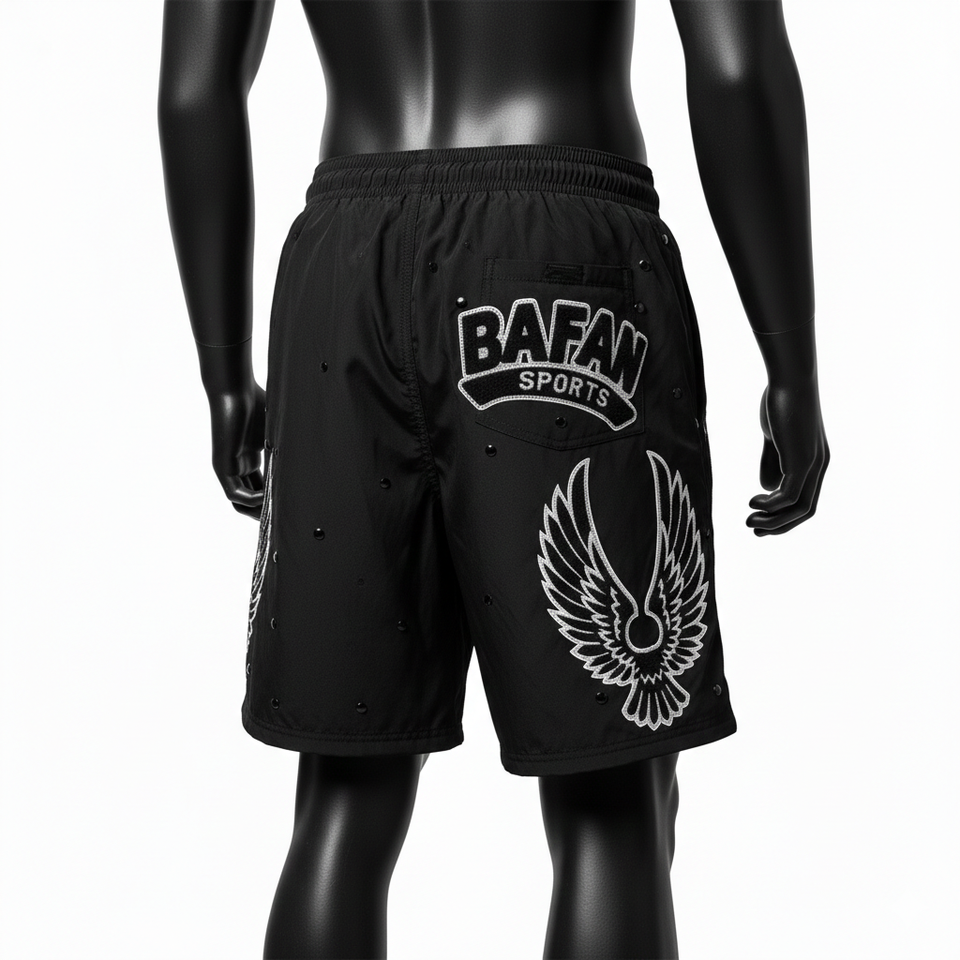 กางเกงว่ายน้ำชายผ้าไมโครไฟเบอร์โพลีเอสเตอร์ 140 GSM สีดำเข้ม พร้อมโลโก้แบบรีดร้อน ประดับคริสตัล ดีไซน์สั่งทำพิเศษ
