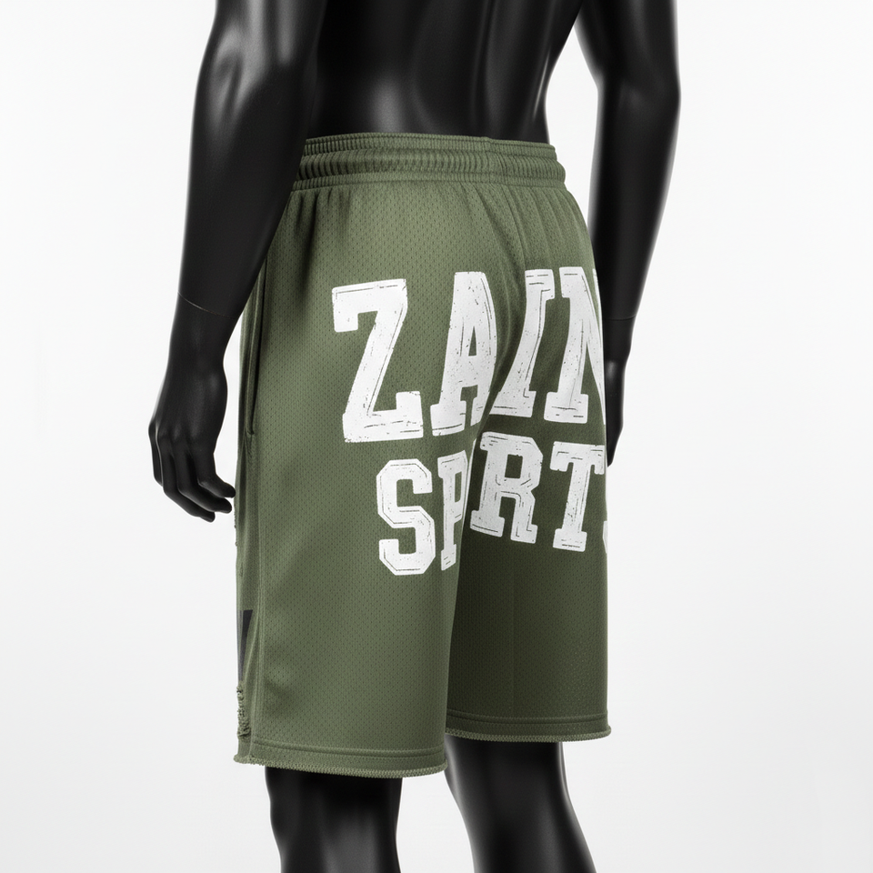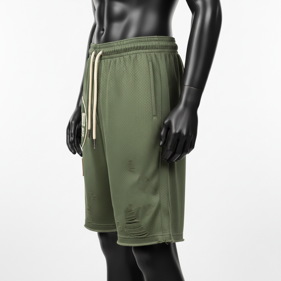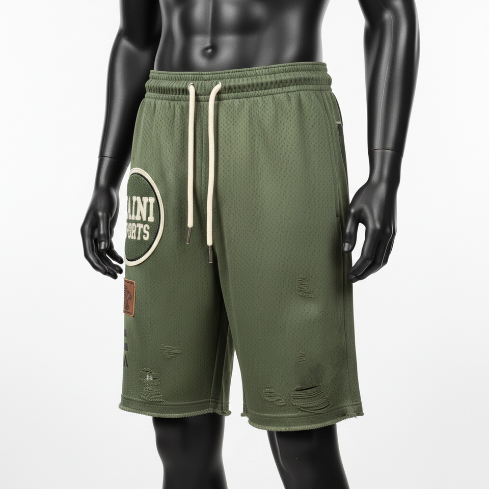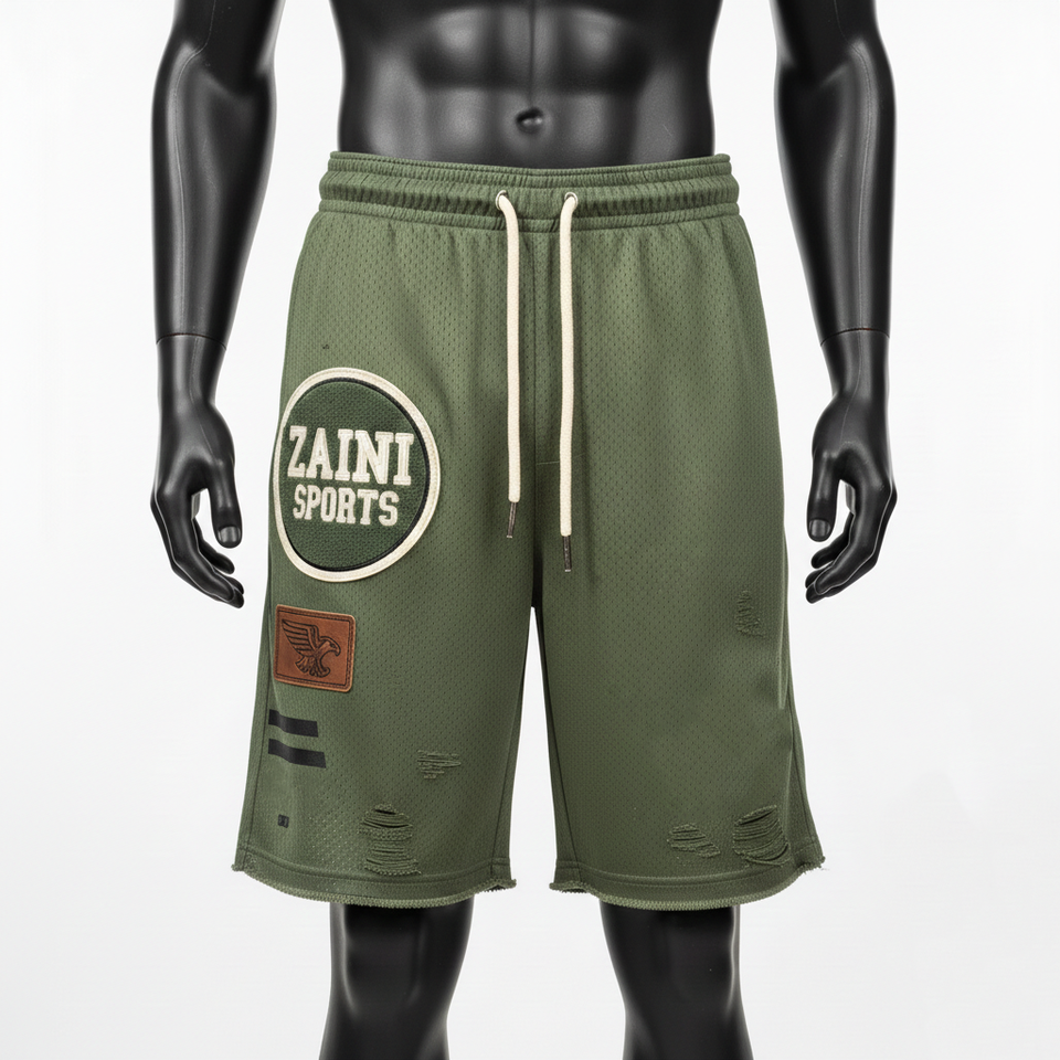 กางเกงขาสั้นออกกำลังกายผู้ชายผ้าโพลีเอสเตอร์ตาข่ายสีเขียวมะกอก 180 GSM แห้งเร็ว พร้อมปักโลโก้หนังแบบกำหนดเอง