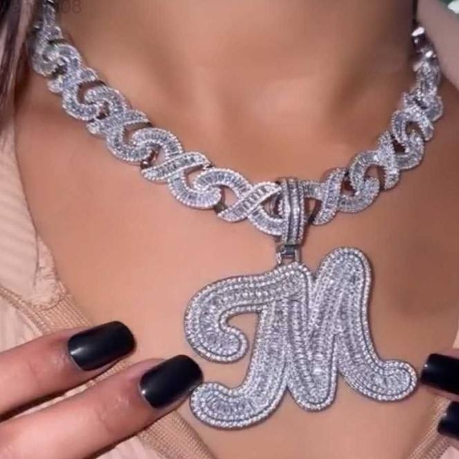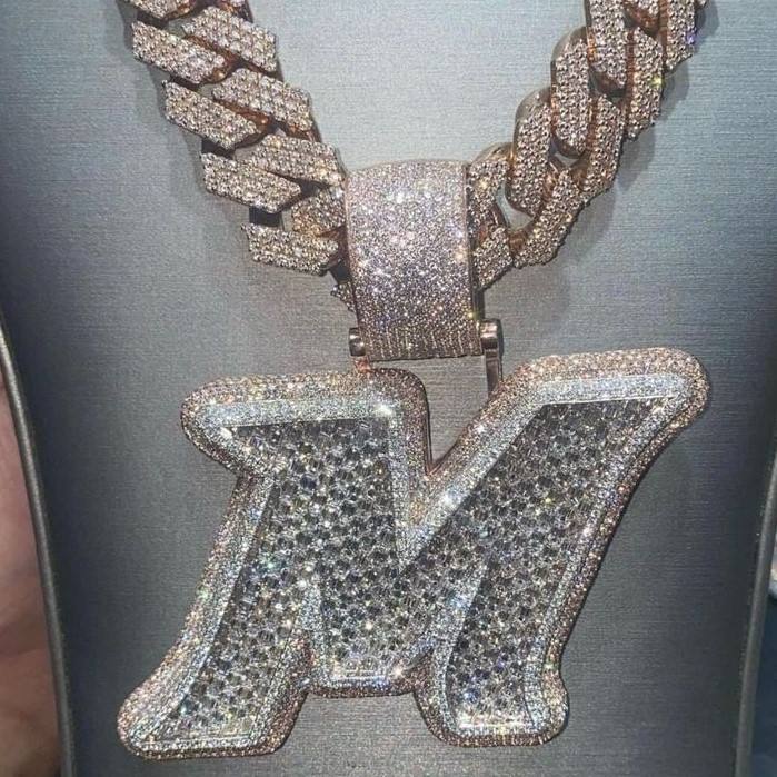 จี้เพชรทรงฮิปฮอปหรูหรา ทองเหลืองชุบทองคำขาว ประดับเพชร VVS คุณภาพสูง ตัวอักษร M แบบกำหนดเองได้ สำหรับผู้ชายและผู้หญิง