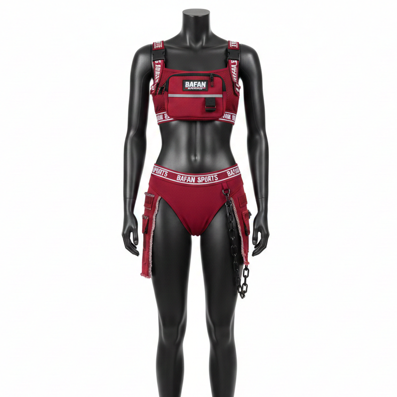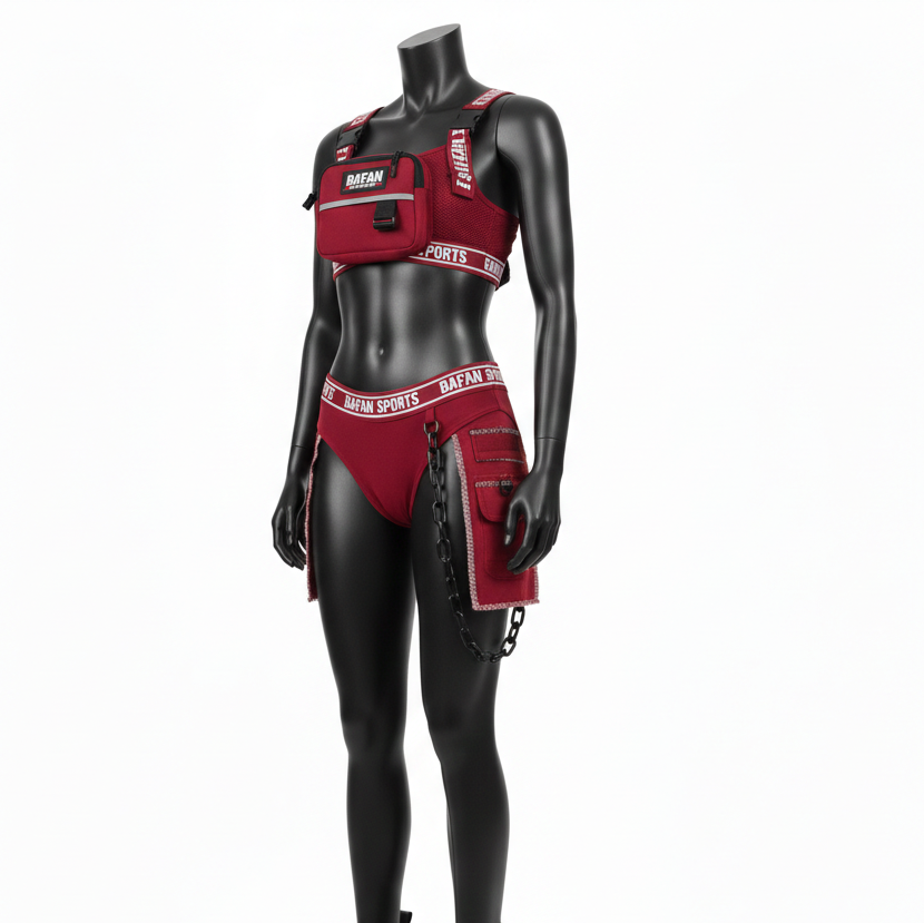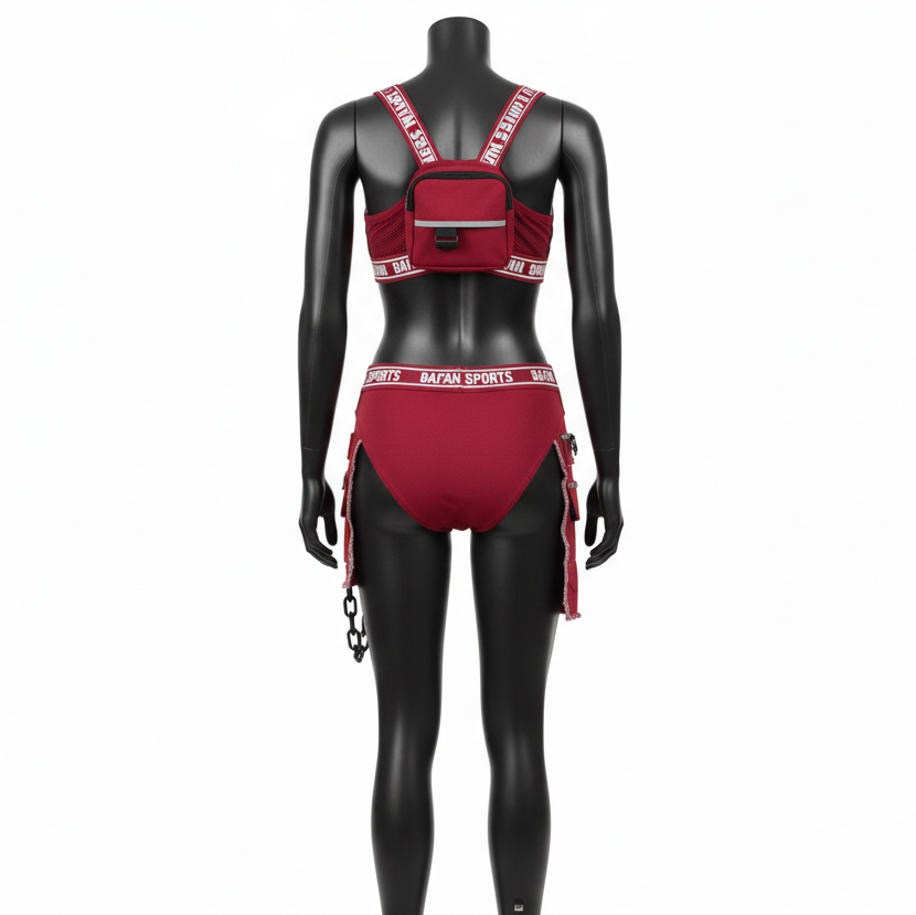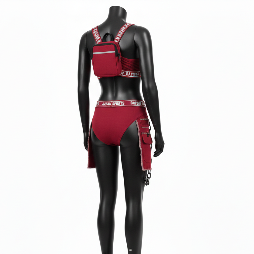 ชุดบิกินี่ผ้าโพลีเอสเตอร์ผสมสแปนเด็กซ์เนื้อนุ่มยืดหยุ่น 190 GSM สีแดง พร้อมกระเป๋าแบบคาร์โก้ ลายพิมพ์โลโก้ สำหรับผู้หญิง