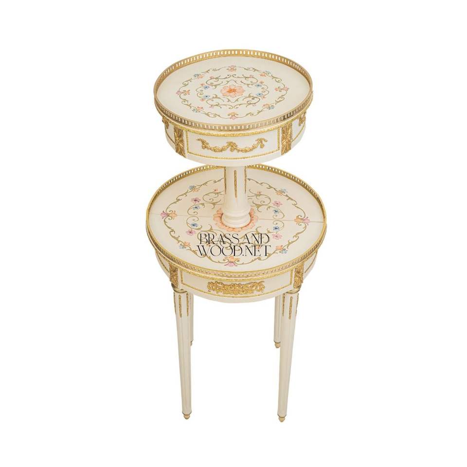 โต๊ะข้างทรงกลมสีขาว 2 ชั้นสุดหรู พร้อมลวดลายดอกไม้เพ้นท์มือ ตกแต่งด้วยทองเหลือง และช่องเก็บของบุผ้ากำมะหยี่