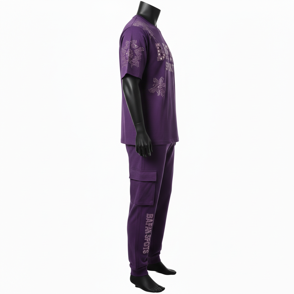 เสื้อยืดผู้ชายสีม่วงผ้าเจอร์ซีย์ผสมคอตตอน 210GSM หรูหรา พร้อมกางเกงจ็อกเกอร์แบบมีแถบข้าง โลโก้แบบสปาร์คเกิลฮีททรานเฟอร์ ชุดเซ็ต 2 ชิ้นสำหรับผู้ชาย