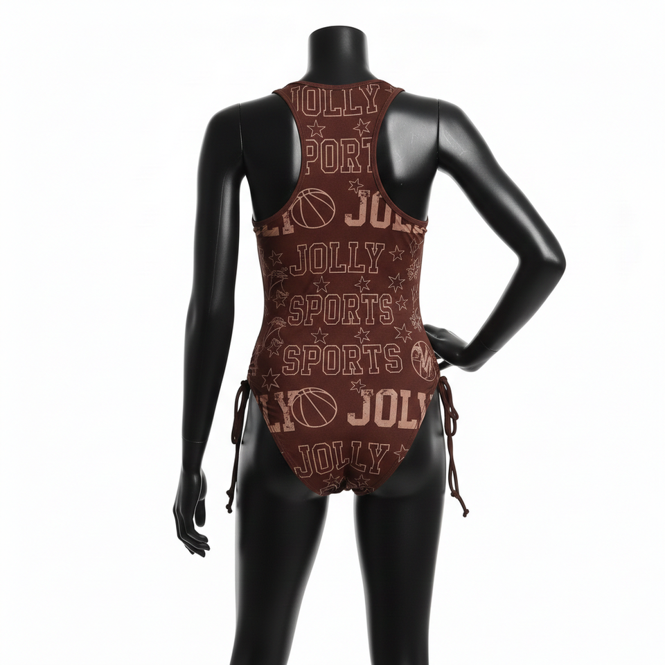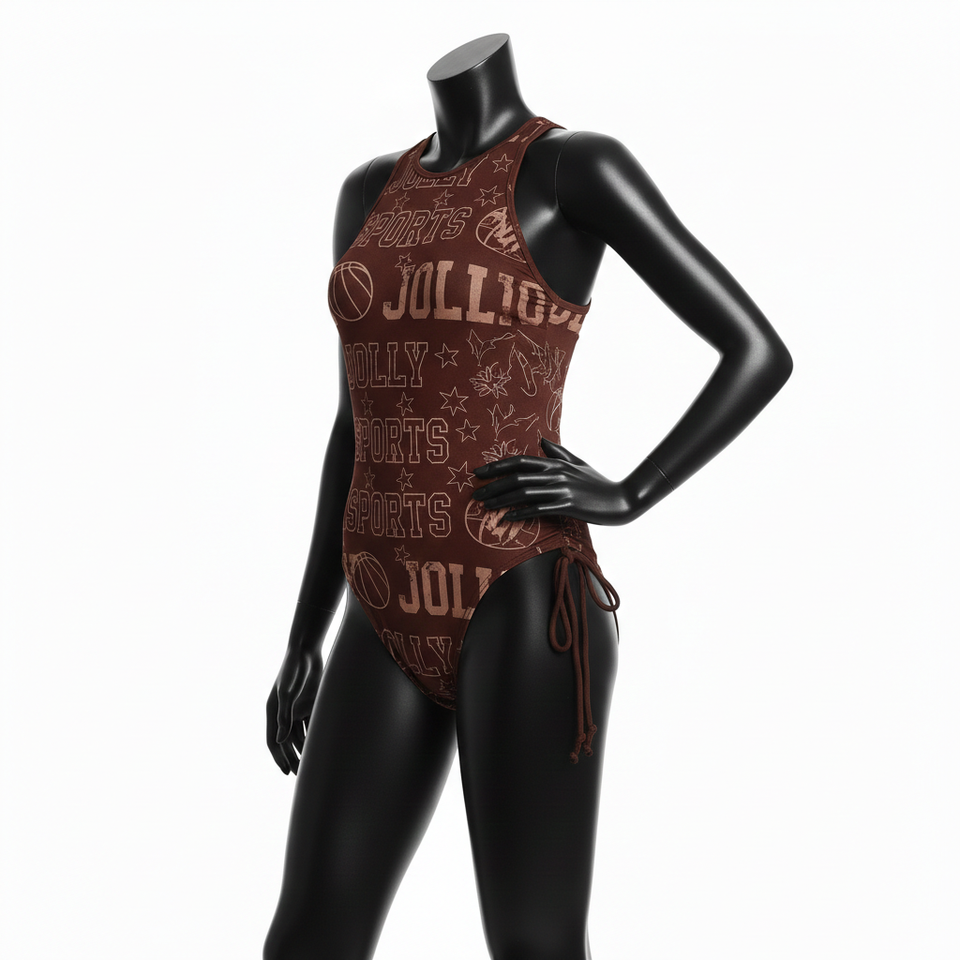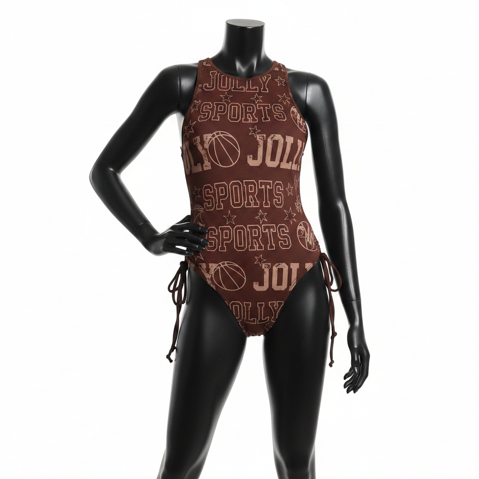 ชุดว่ายน้ำลายกราฟิกสีน้ำตาล ผ้าสแปนเด็กซ์ไนลอน 220 GSM ระบายอากาศได้ดี ยืดหยุ่น ผูกด้านข้าง พร้อมโลโก้สั่งทำพิเศษสำหรับผู้หญิง