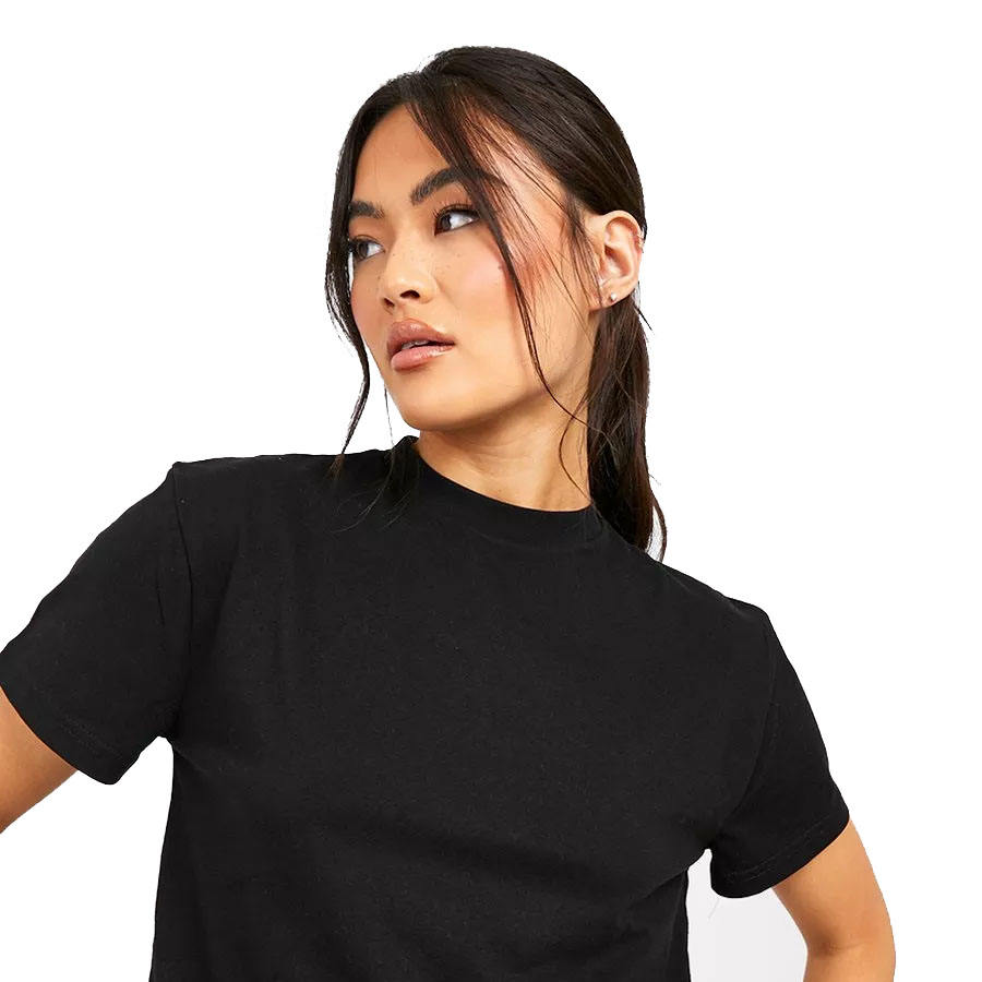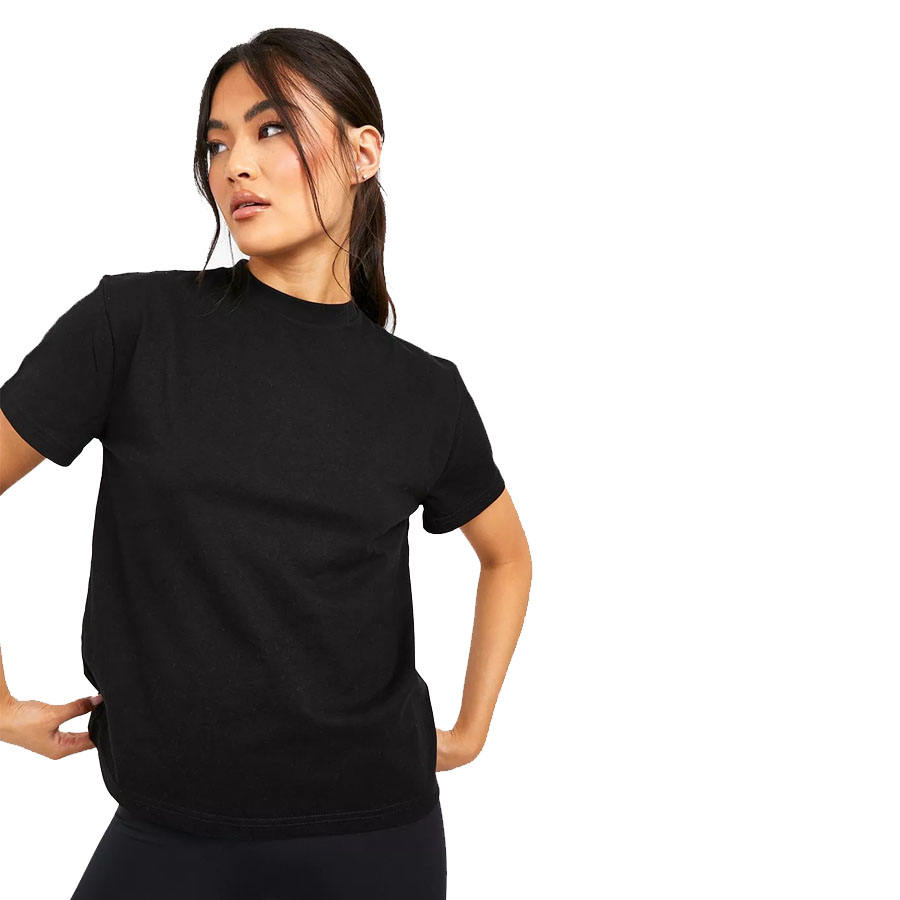 เสื้อยืดแขนสั้นเปิดไหล่สำหรับผู้หญิงทำจากผ้าฝ้าย GSM 290หรูหราสั่งพิมพ์โลโก้ได้เองสีดำล้วน