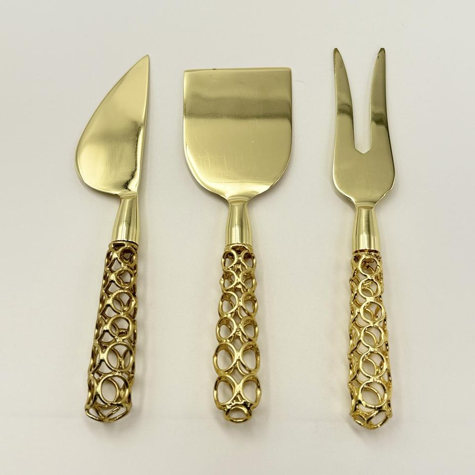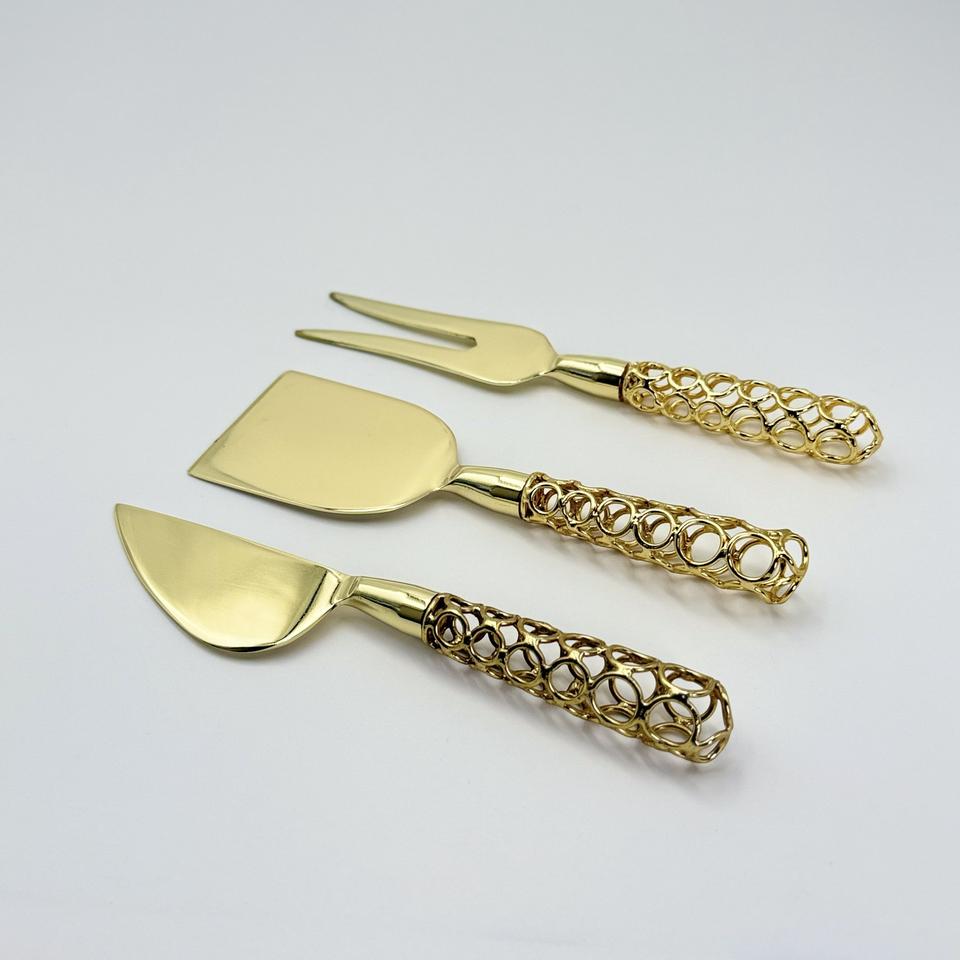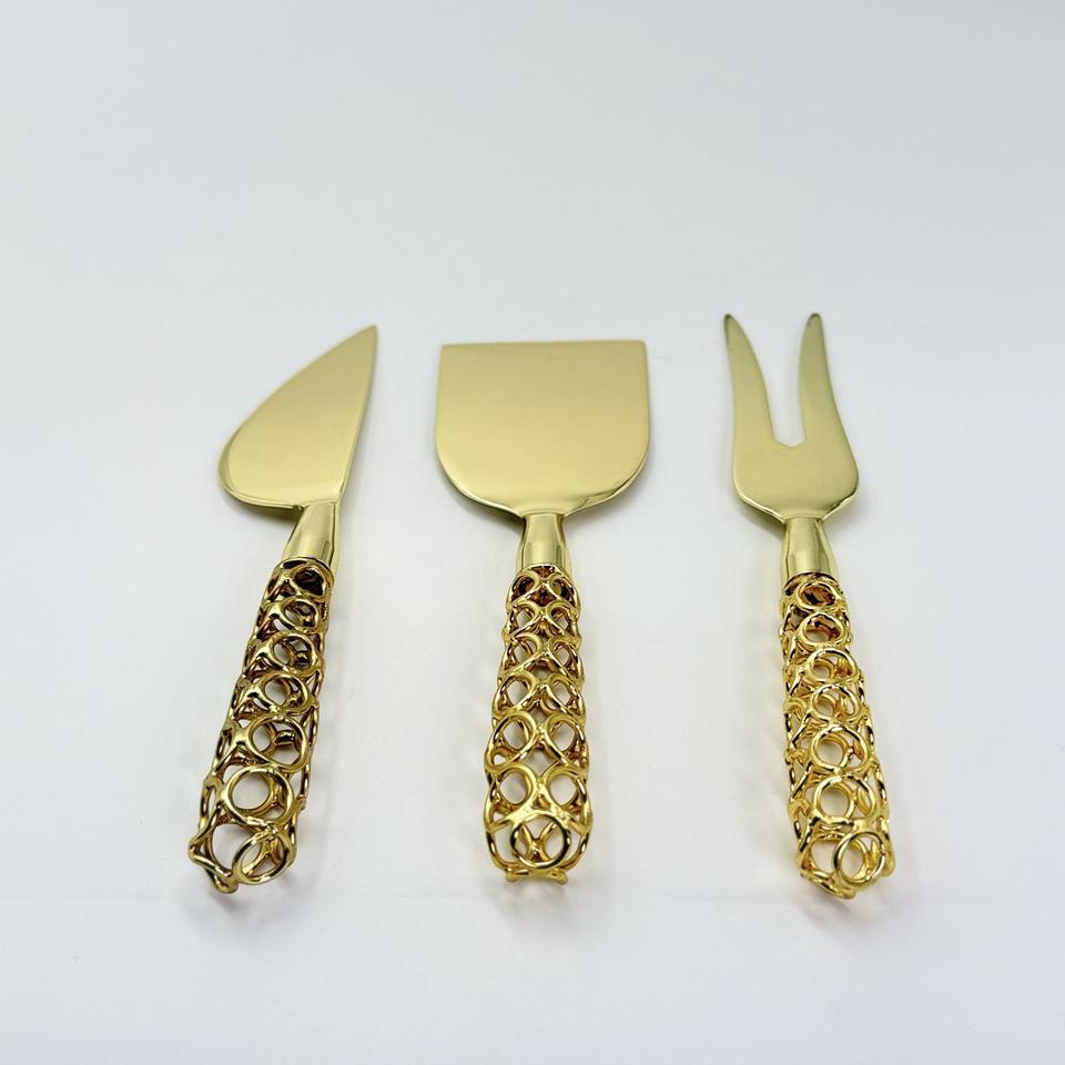 ชุดมีดชีสสแตนเลสสีทอง 3 ชิ้น ดีไซน์หรูหรา พร้อมด้ามจับลวดเหล็ก สำหรับหั่น ตัด และปาดชีส