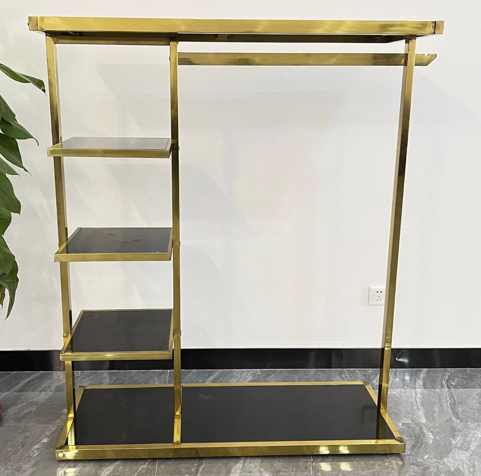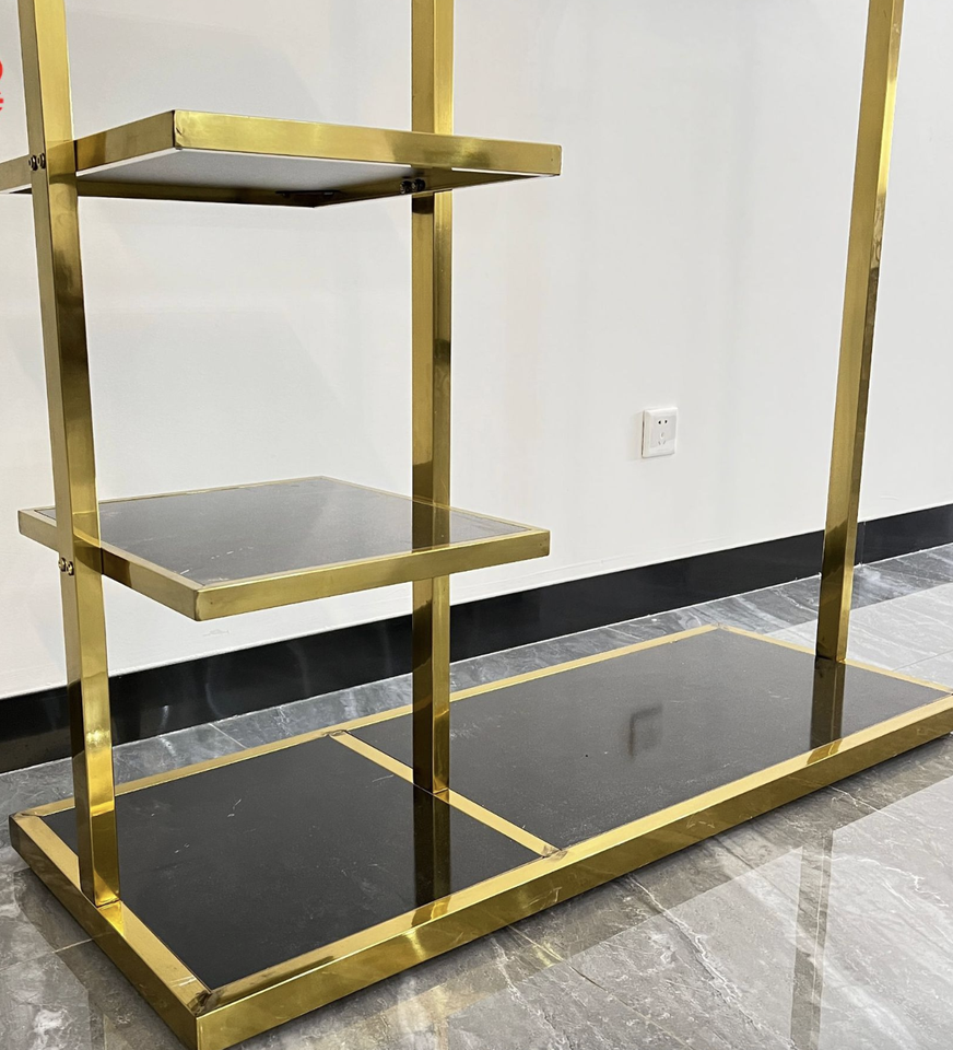 ราวแขวนเสื้อผ้าสแตนเลสสีทอง 3 ชั้น ดีไซน์หรูหราทันสมัย แบบกำหนดเองได้ พร้อมบรรจุภัณฑ์กล่องกระดาษแข็ง สำหรับร้านบูติก