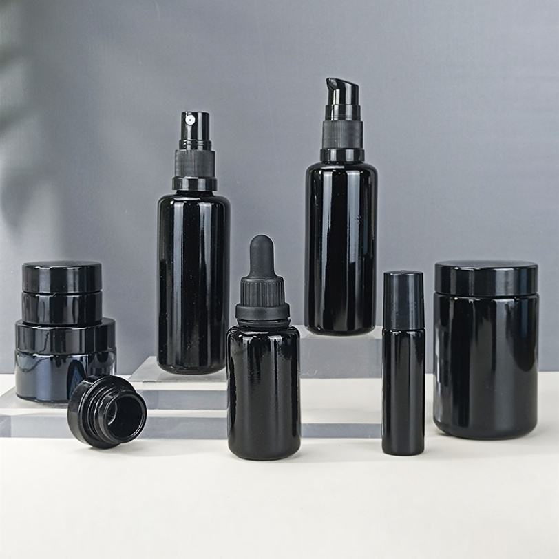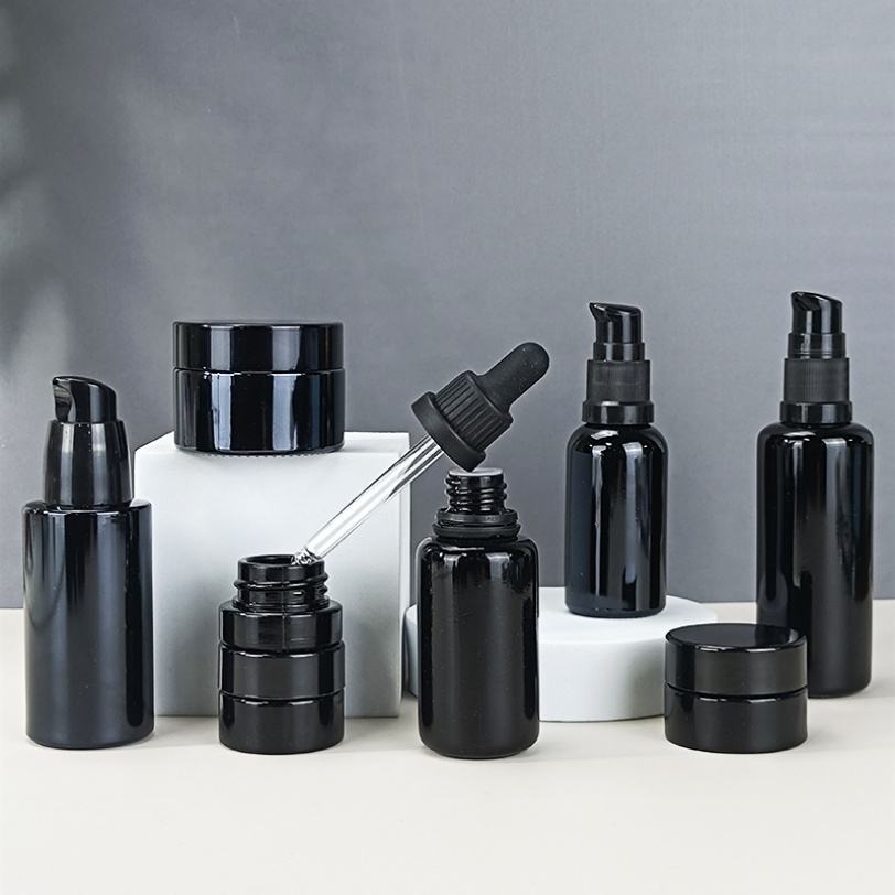 ขวดแก้วสีม่วงเข้มขนาด 30 มล. 50 มล. 100 มล. สำหรับน้ำมันหอมระเหยแบบหรูหรา พร้อมหัวหยดและหัวปั๊มสเปรย์ และกระปุกครีมทาหน้า
