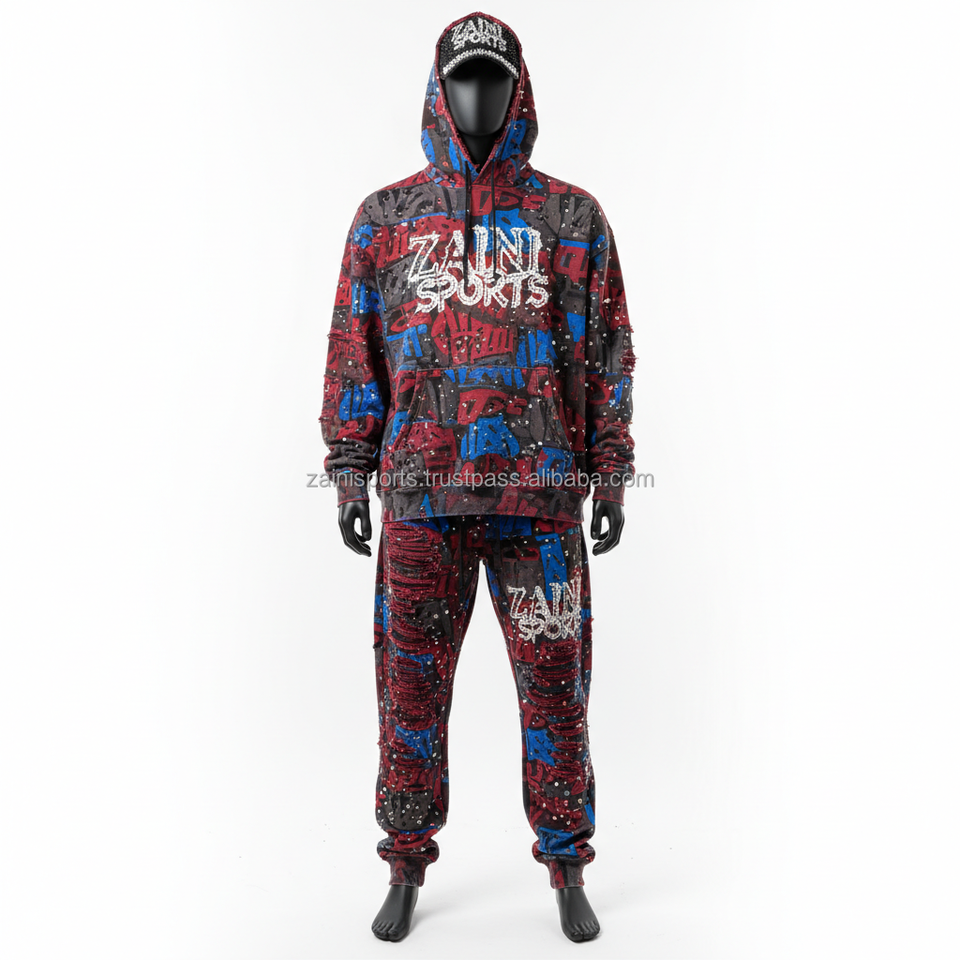 ชุดวอร์มผ้าฝ้ายพิมพ์ลายสำหรับผู้ชายผ้าโพลีเอสเตอร์320 GSM พิมพ์ลายสีแดงฟ้าดำสไตล์พัฟโลโก้พลอยเทียมใส่ได้พอดีกับผู้ชาย