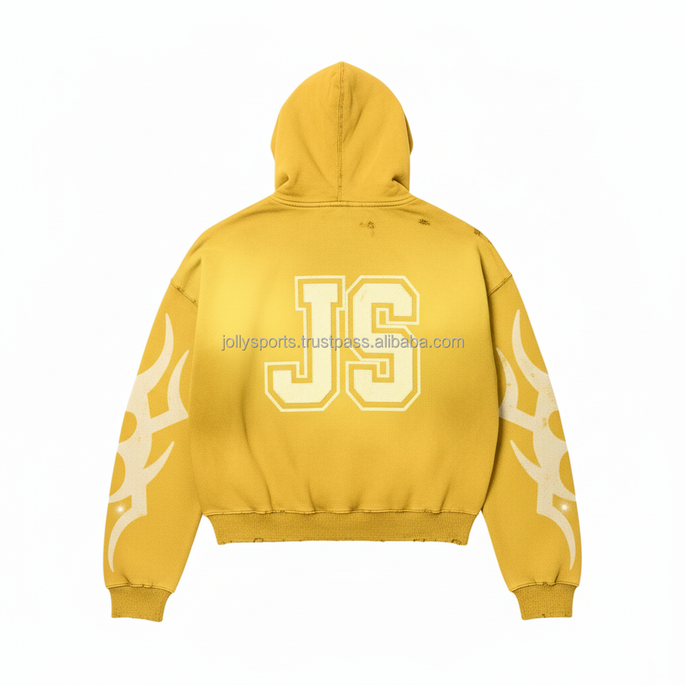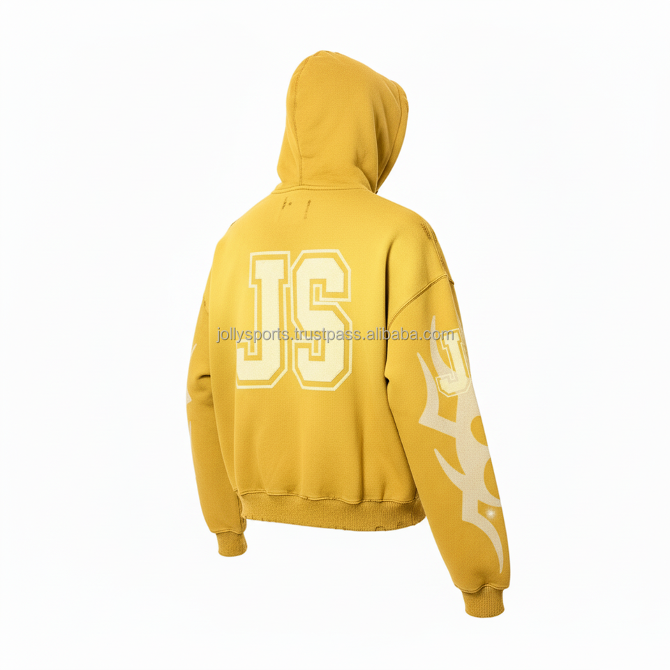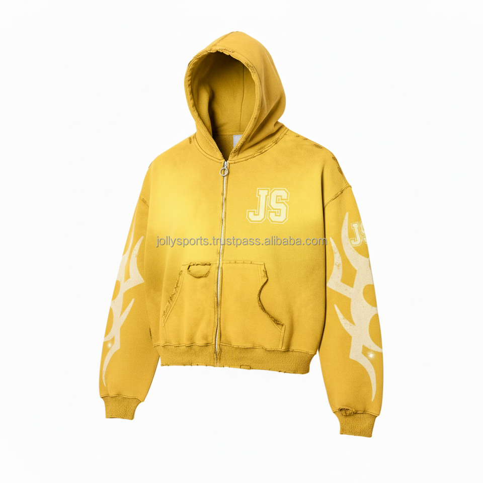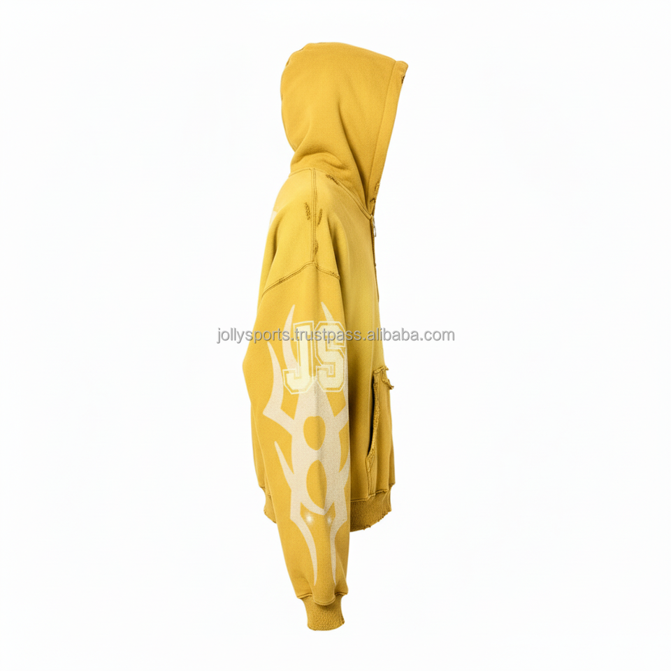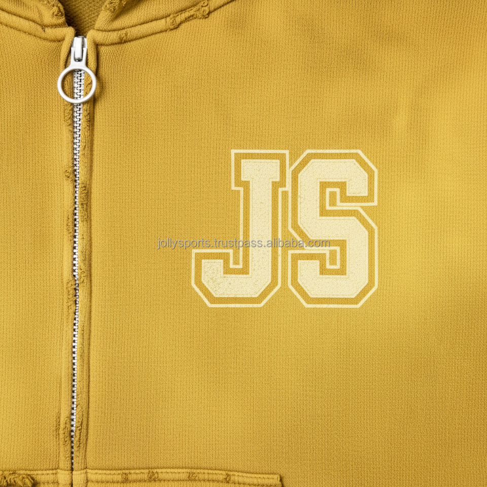 เสื้อมีฮู้ดซิปผ้าฝ้ายผสมโพลีเอสเตอร์สีเหลืองมัสตาร์ดดีไซน์ปักโลโก้ได้ตามต้องการหรูหรา365 GSM