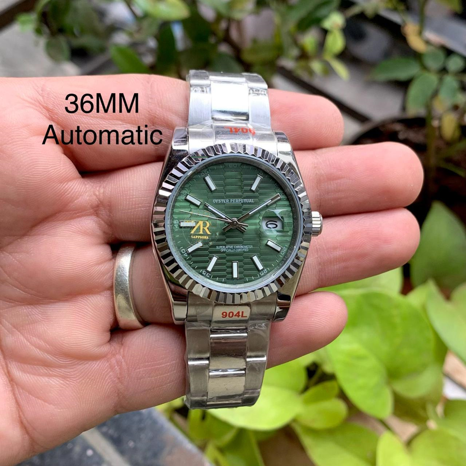 นาฬิกาอัตโนมัติคุณภาพสูงขนาด 36 มม. พร้อมหน้าปัดลายรังผึ้งสีเขียวขอบหน้าปัดแบบฟลูเต็ด ตัวเรือนสแตนเลส