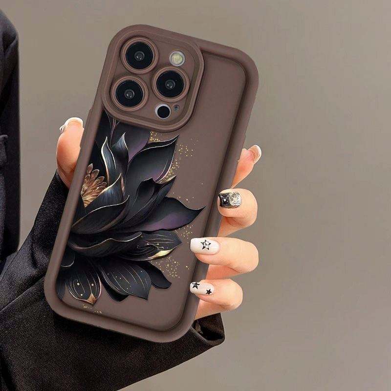 เคสโทรศัพท์กันกระแทกพิมพ์ลาย 3 มิติ ลายดอกบัวสีดำทอง หรูหรา เหมาะสำหรับ iPhone17 16 15 Pro Max 14 13 12 11 XS XR หรูหรา 3 มิติ
