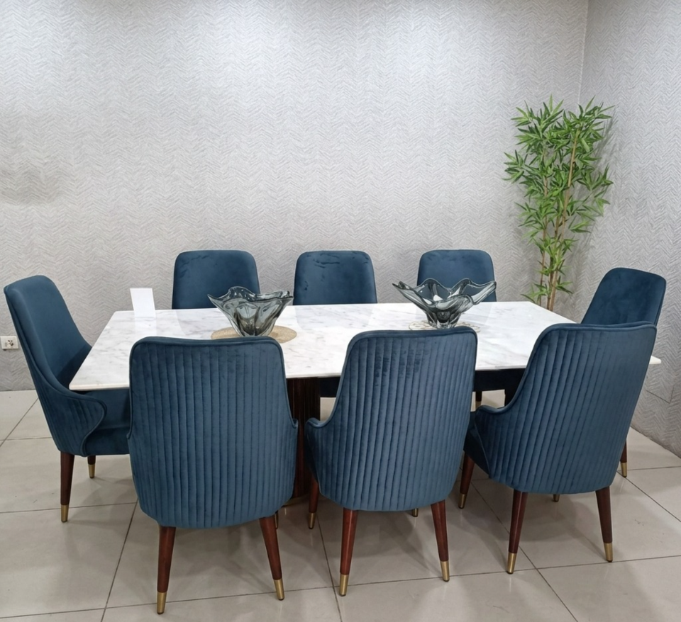 ชุดโต๊ะรับประทานอาหารหินอ่อนและไม้ดีไซน์เอเชียแบบเซน 6 ที่นั่ง พร้อมเก้าอี้กำมะหยี่ สำหรับห้องนั่งเล่น หรูหราและเป็นมิตรกับสิ่งแวดล้อม