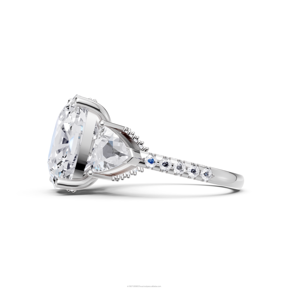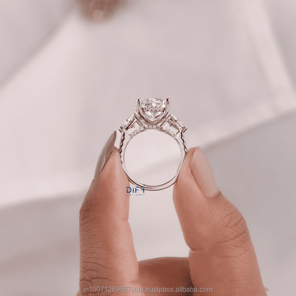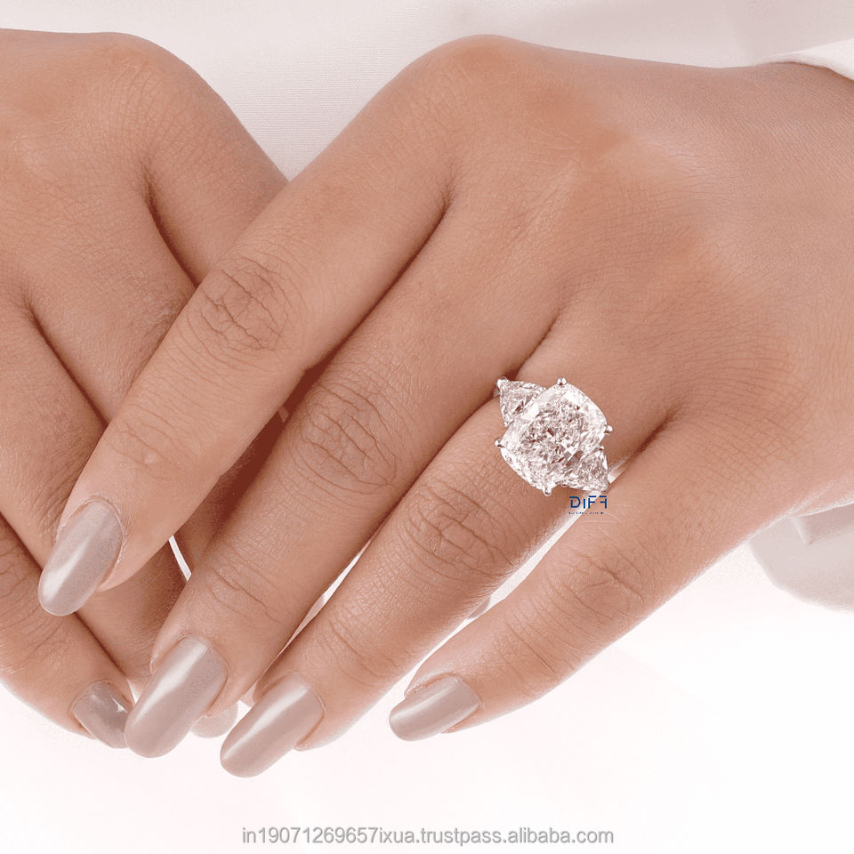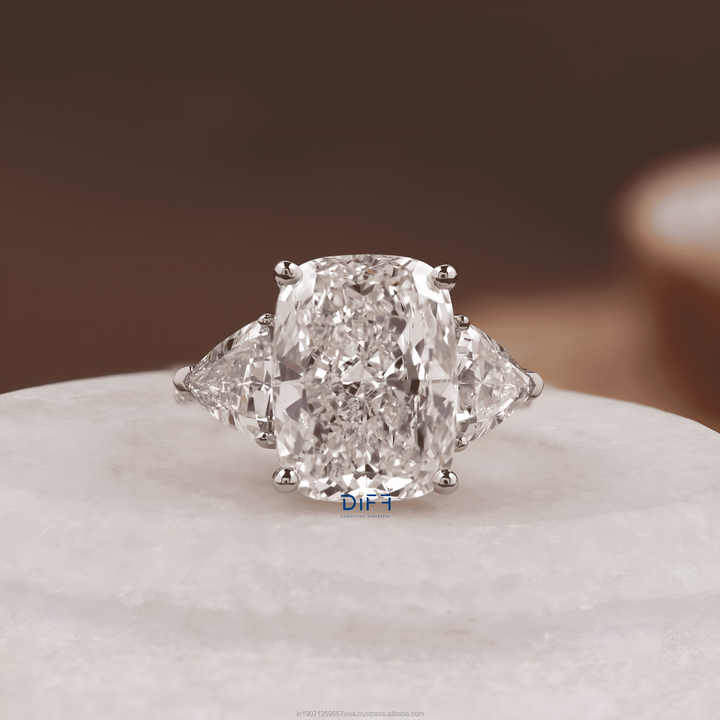 แหวนเพชรทรงคุชชั่น 7 กะรัต หรูหรา แหวนหมั้นเพชรสามเม็ด พร้อมวงแหวนซ่อนรอบเพชร