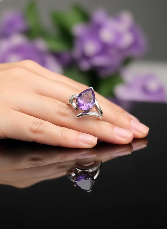 แหวนเงินแท้ 925 ดีไซน์เรียบหรู ประดับพลอยแอมเมทิสต์ทรงลูกแพร์ ของขวัญวันครบรอบแต่งงาน/หมั้น สัญลักษณ์คริสเตียน เดือนกุมภาพันธ์
