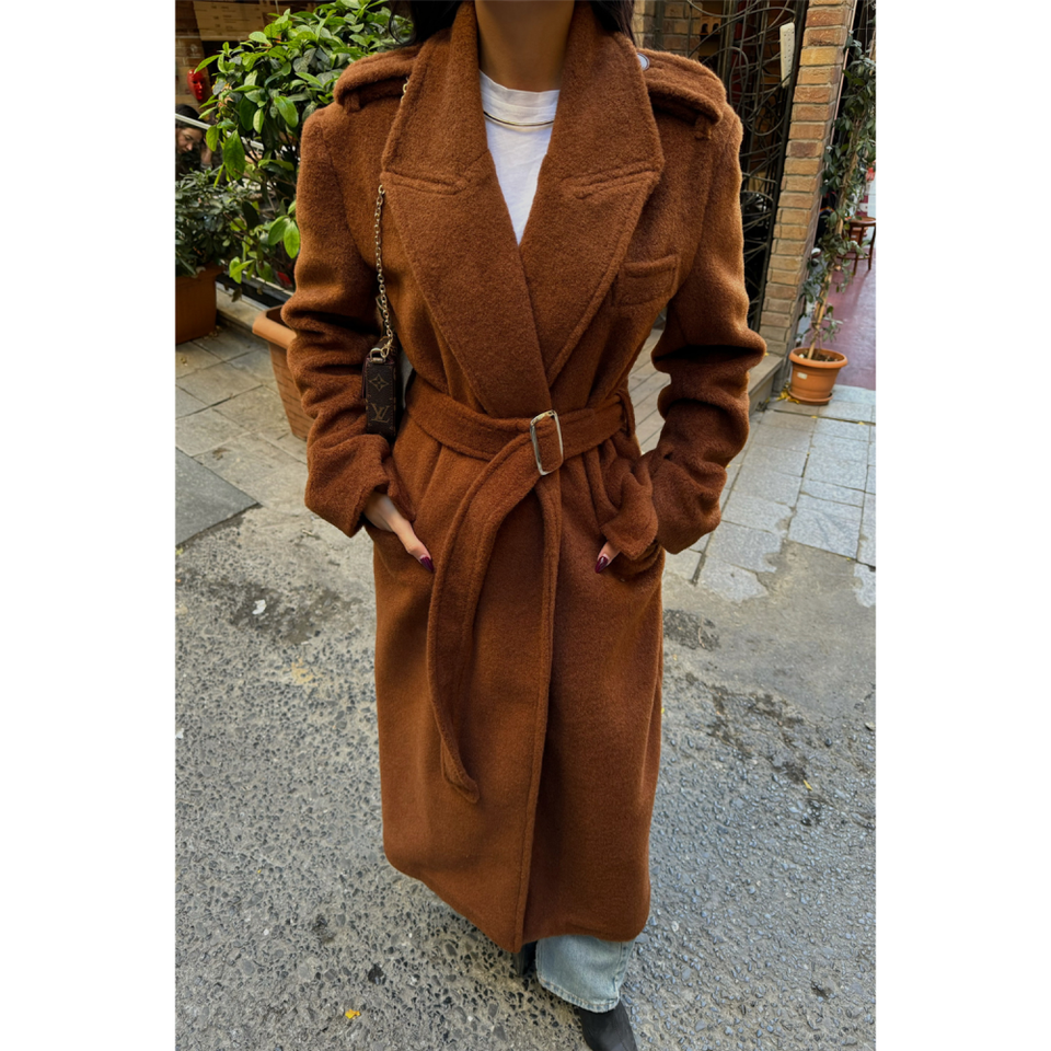 เสื้อโค้ทขนอัลปาก้าสุดหรู สีน้ำตาล แต่งขนฟ็อกซ์ ซับในผ้าลินิน พร้อมเข็มขัดสำหรับฤดูหนาว ตกแต่งด้วยผ้าขนสัตว์อุ่นๆ ลายสวยงาม