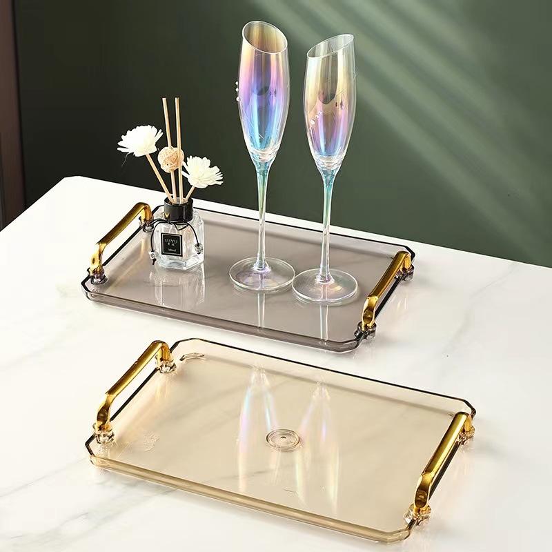 ถาดเสิร์ฟอะคริลิคหรูหราพร้อมหูจับสีทอง ถาดรองแก้วน้ำทรงสี่เหลี่ยม สำหรับตกแต่งบ้านหรือเป็นของขวัญ